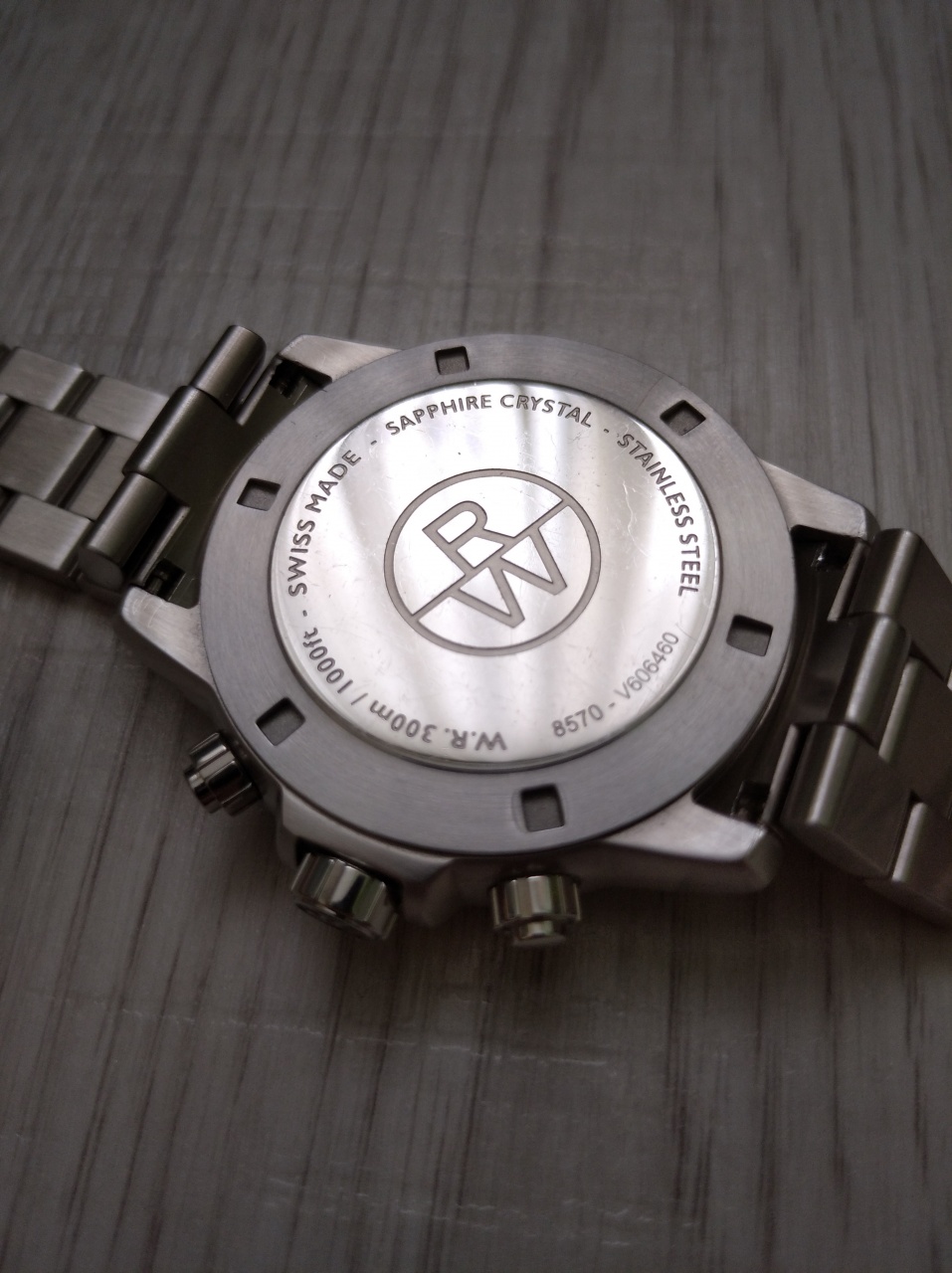 Swiss Made Quartz, секунда на 3 часа, дата на 4 часа, все стрелки хронографа красные.