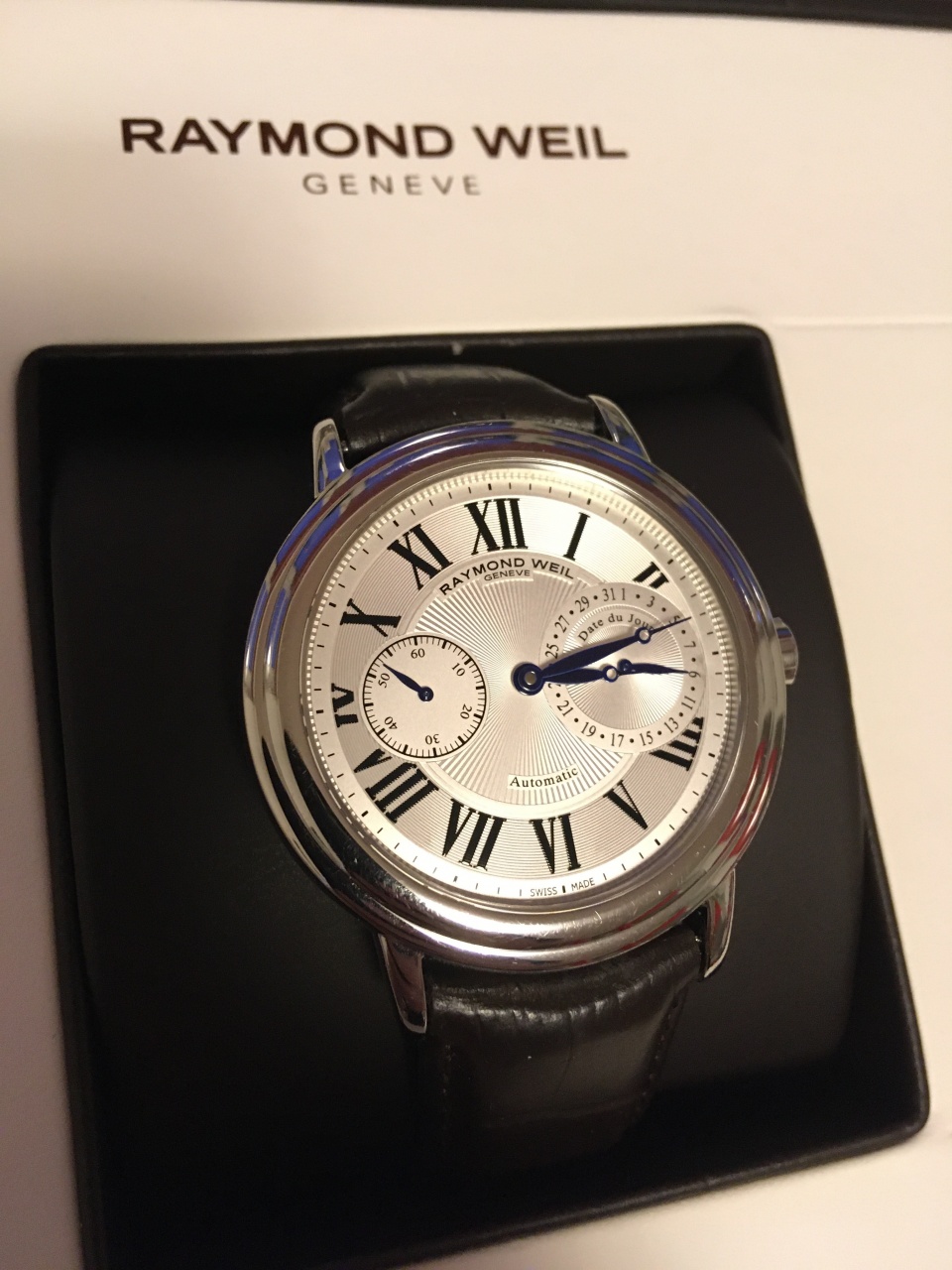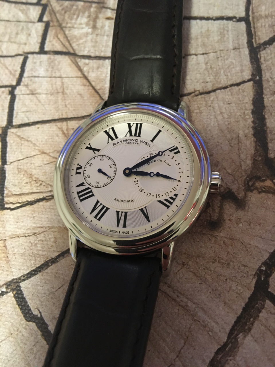 В наличии прекрасные часы Raymond Weil Maestro 2846-STC-00659 в отличном состоянии. Присутствует легкая паутинка на корпусе (сколов, вмятин, глубоких царапин нет), ремешок с внутренней стороны чуть уставший. Полный комплект.