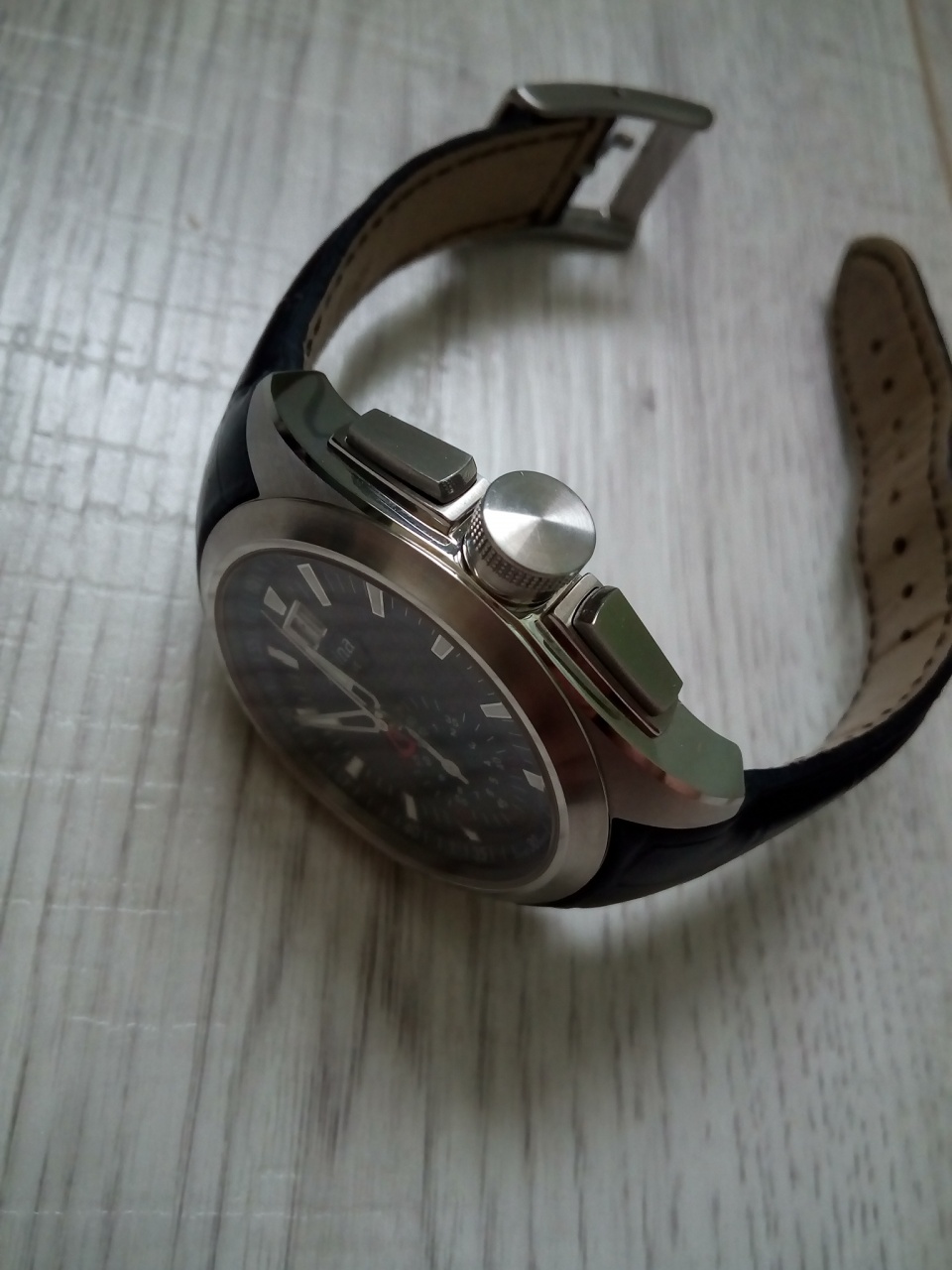 большая дата на 12 часов, манеж хронографа на 6 часов с двумя стрелками (30 минут и 12 часов), секундная стрелка хронографа в центре,