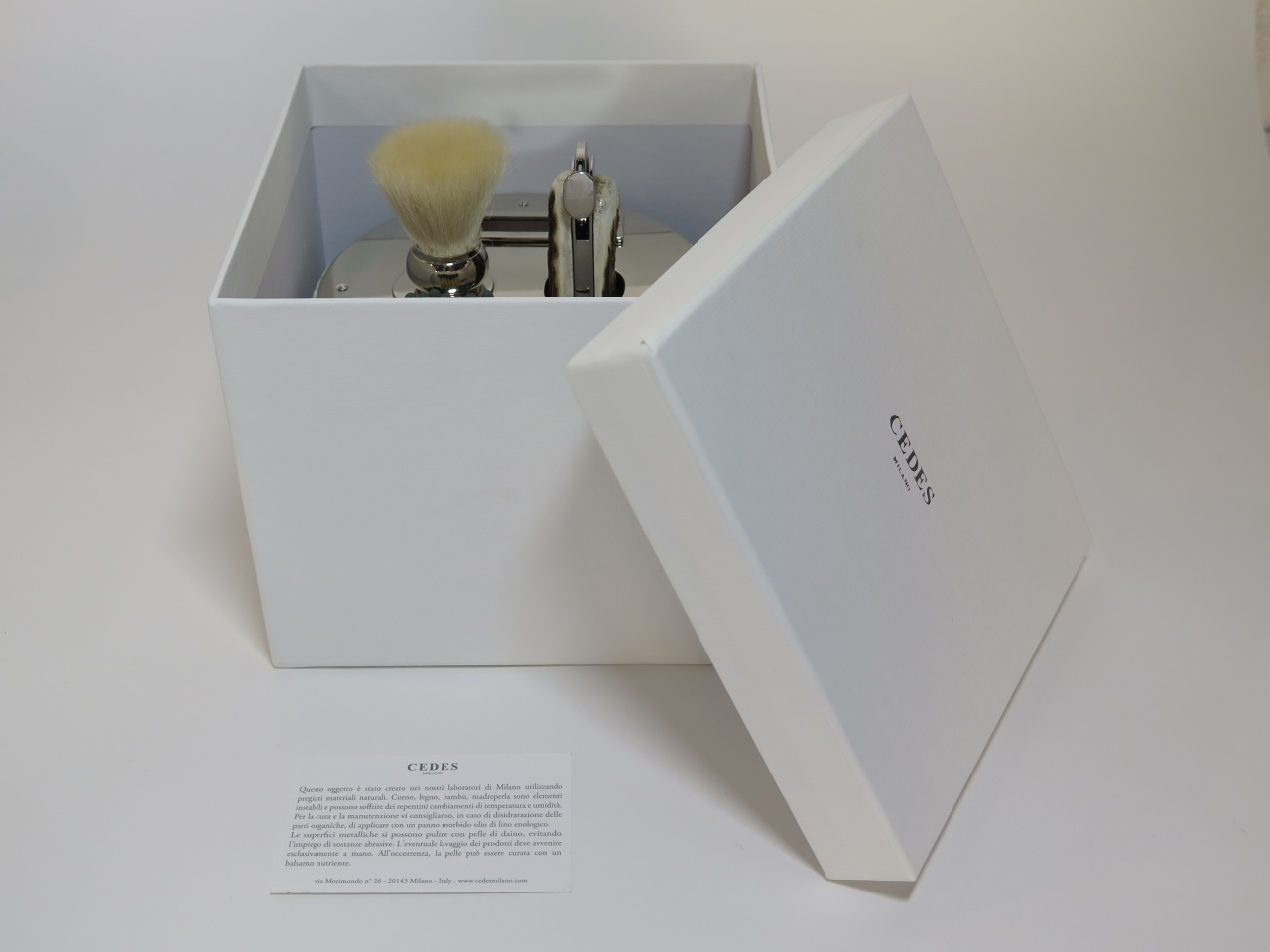 Детали и декоративные элементы набора изготовлены из хромированной стали с зеркальной полировкой. Набор включает в себя: 1) подставку с отделениями для сигарных спичек, гильотины, кисточки и сменяемый абразивный воспламенитель для спичек; 2) гильотину для обрезания сигар/нож для вскрытия коробок с сигарами; 3) кисточку с щетиной из барсучьего меха для очищения сигар от налета; 4) комплект сигарных спичек.