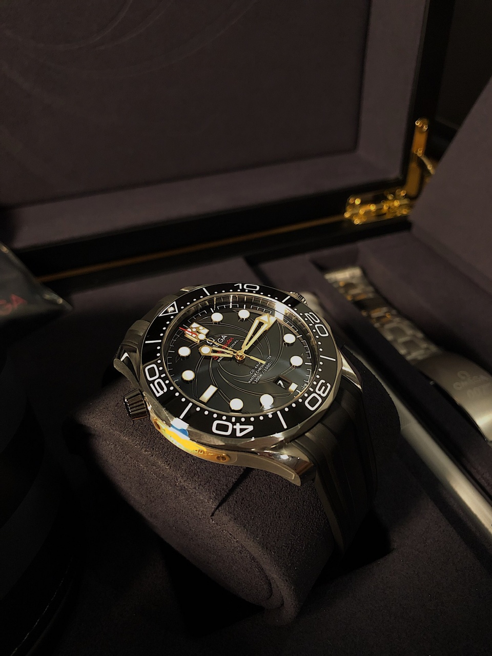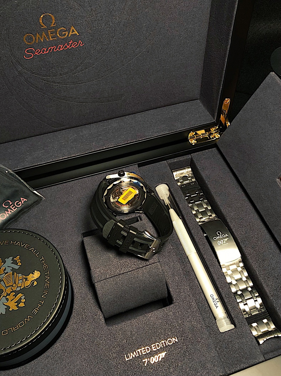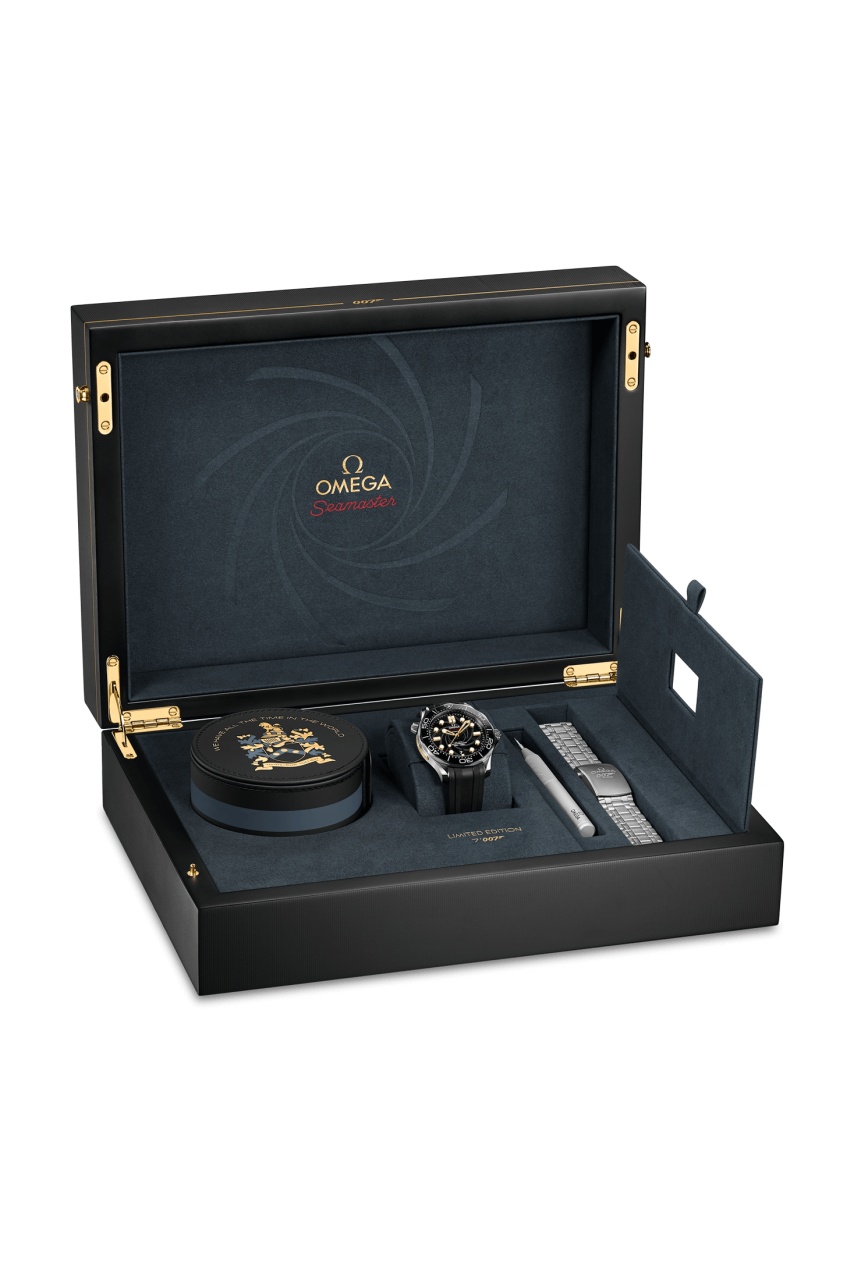 - На внутреннюю сторону задней крышки из сапфирового стекла нанесен фамильный герб семьи Бонд, выгравированный в черно-золотых тонах;