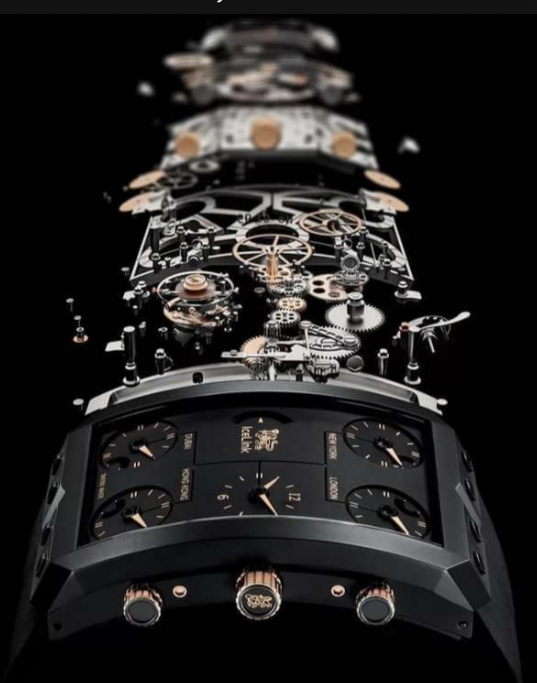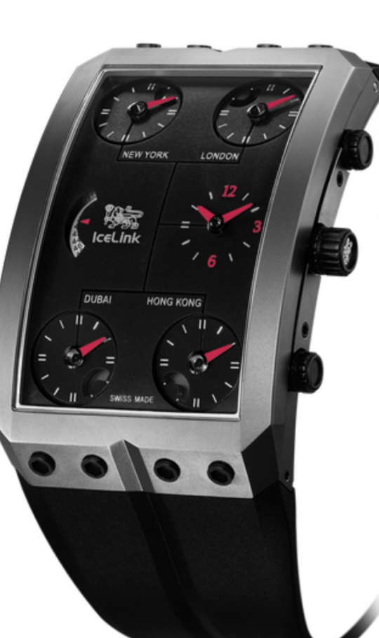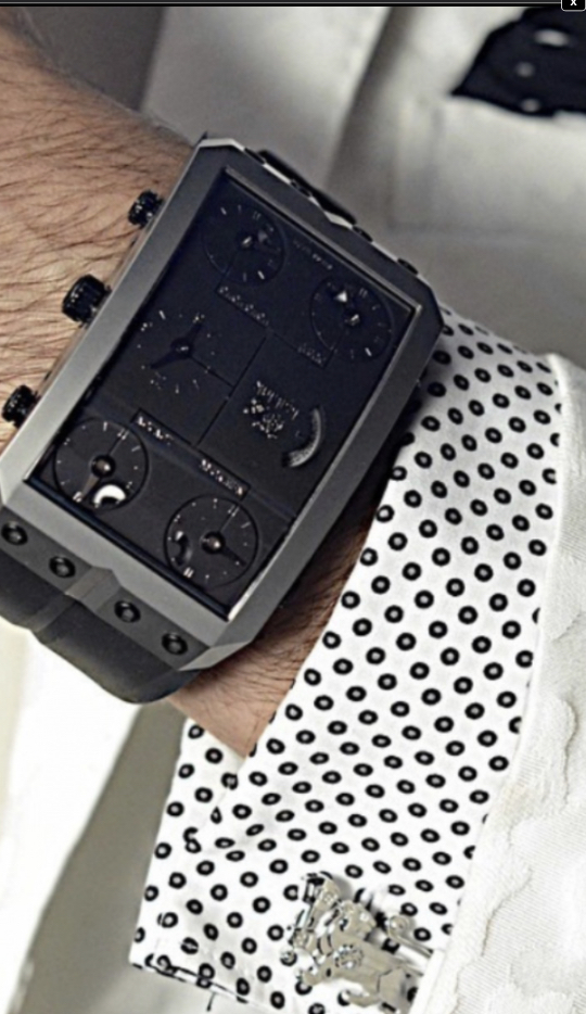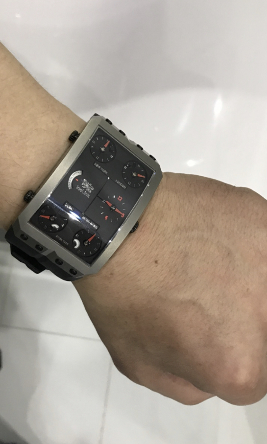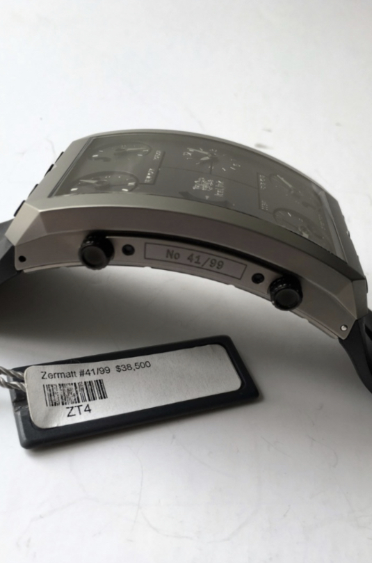 Сапфировое стекло, модель оснащена мануфактурным механическим калибром, обеспечивающим одновременную индикацию времени в пяти часовых зонах на отдельных малых циферблатах. Причем, настройка времени на одном из этих циферблатов обеспечивает автоматическую его установку и на других четырех циферблатах.Поставляется на черном каучуковом ремешке. Лимитированный выпуск 37/99 экземпляров., ручной завод, 48 ч резерв хода, титановый водонепроницаемый до 50 метров корпус 63мм*43мм, застежка титан, сапфировое стекло с двух сторон. Ретейлер 2,2 млн. рублей.