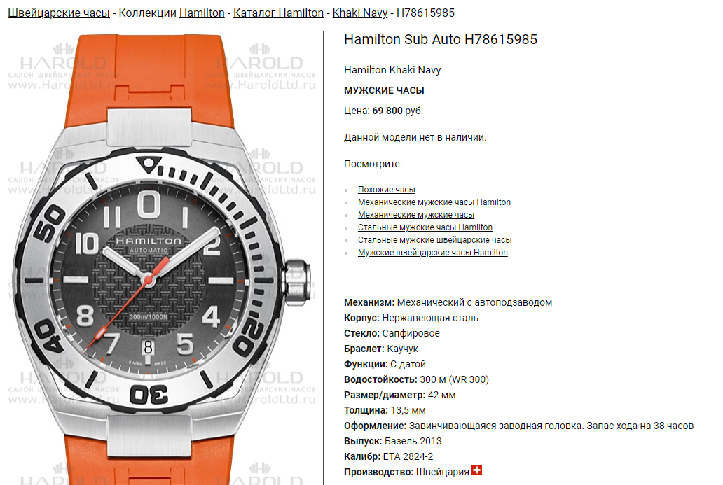 Hamilton Khaki Navy Sub Auto H78615985 ЯРКИЙ, ПОЗИТВНЫЙ ДАЙВЕР / ОРАНЖЕВЫЙ РЕМЕНЬ / WR 30 / D=42 / ETA 2824 - Часовой форум Watch.ru