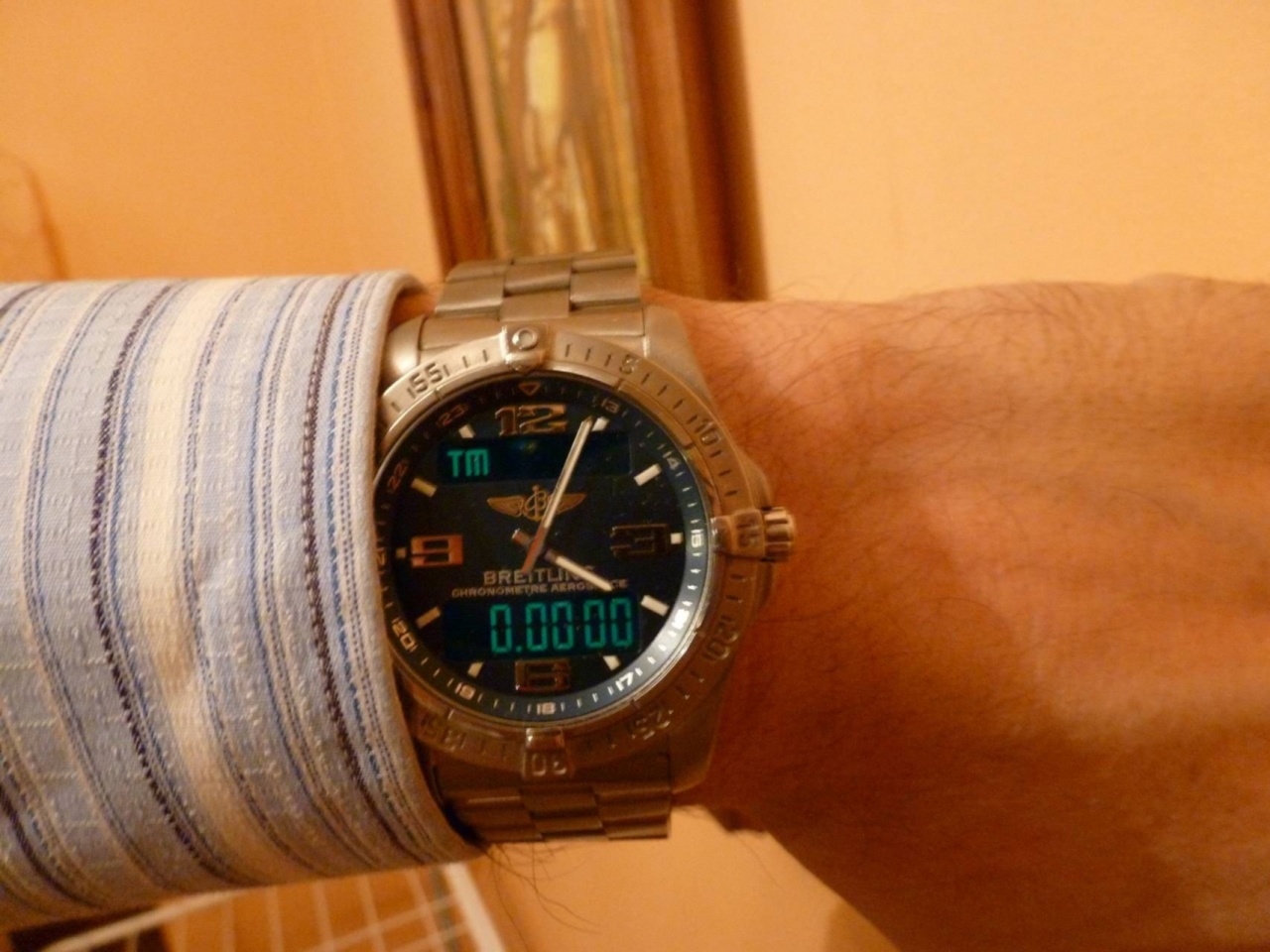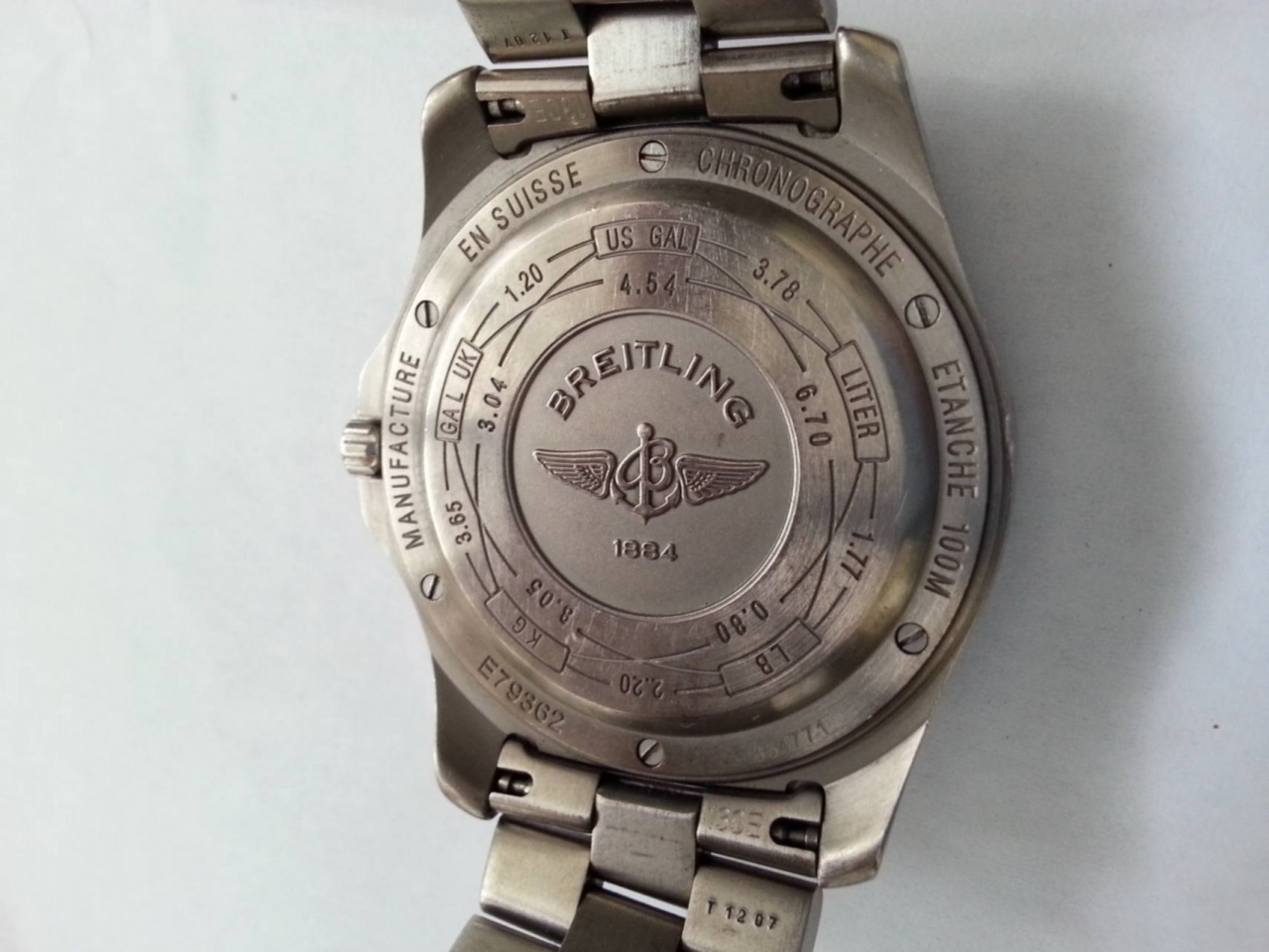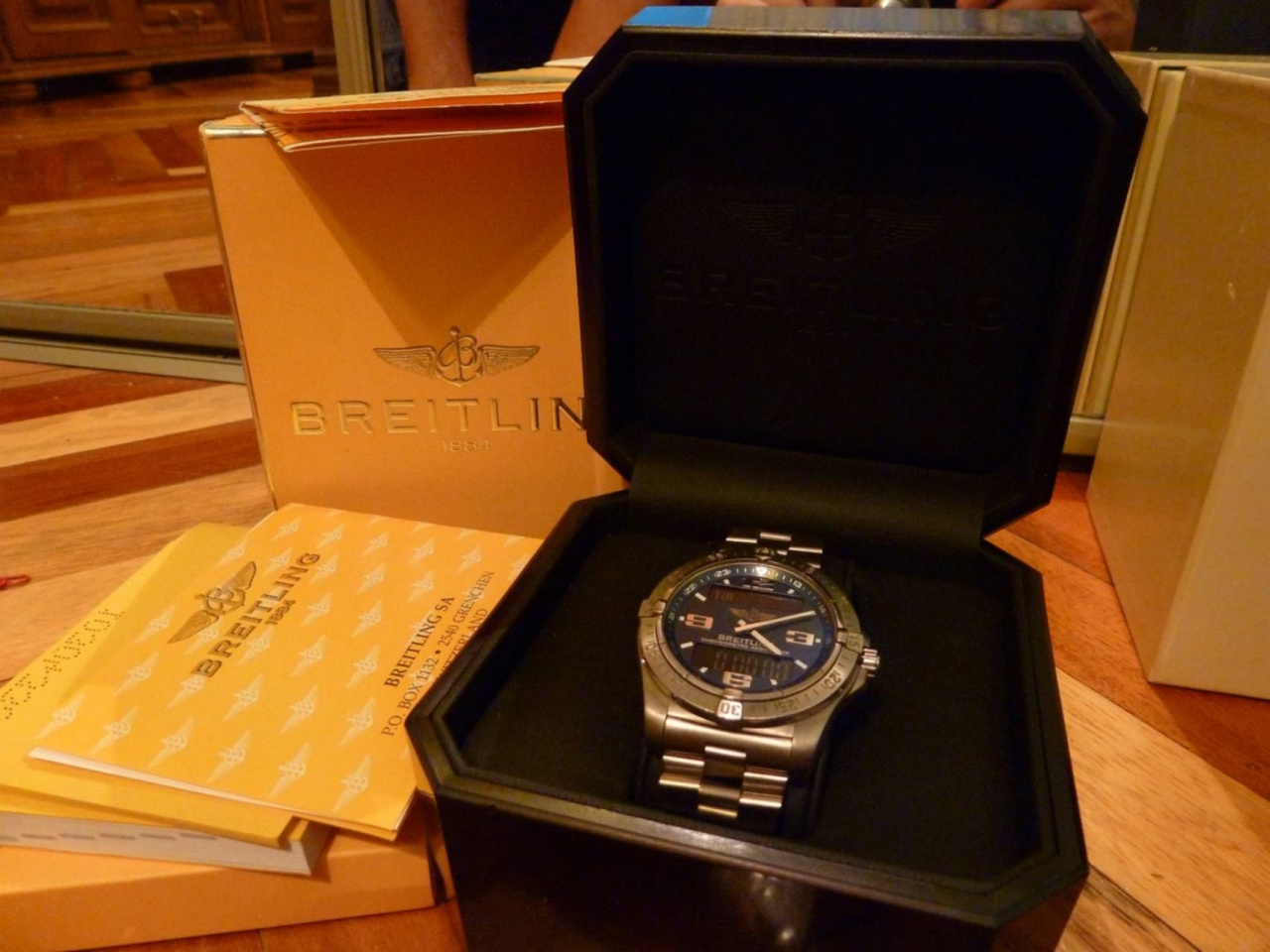 Хронограф: 1/100 секунды до 59 мин. 59,99 сек., часы/минуты/секунды макс. 48ч.; календарь: цифровой, день недели и дата,запрограммирован на 4 года; таймер обратного отсчета, второй часовой пояс, будильник, минутный репетир. Однонаправленный безель вращается со щелчками в направлении против хода стрелок, рельефная поверхность с гравированной разметкой и цифрами с фирменным шрифтом Breitling, капсула со светящимся фотолюминесцентным элементом, расположенным на отметке «12 часов». Переводная коронка с встроенной кнопкой имеет двойную систему уплотнителей для защиты от попадания воды внутрь корпуса. Задняя крышка с гравированной шкалой для пересчета авиатоплива из галлонов в литры соединена с корпусом винтами.В идеальном состоянии,полный комплект коробок и документов. Единственный владелец. Торг, пересылка