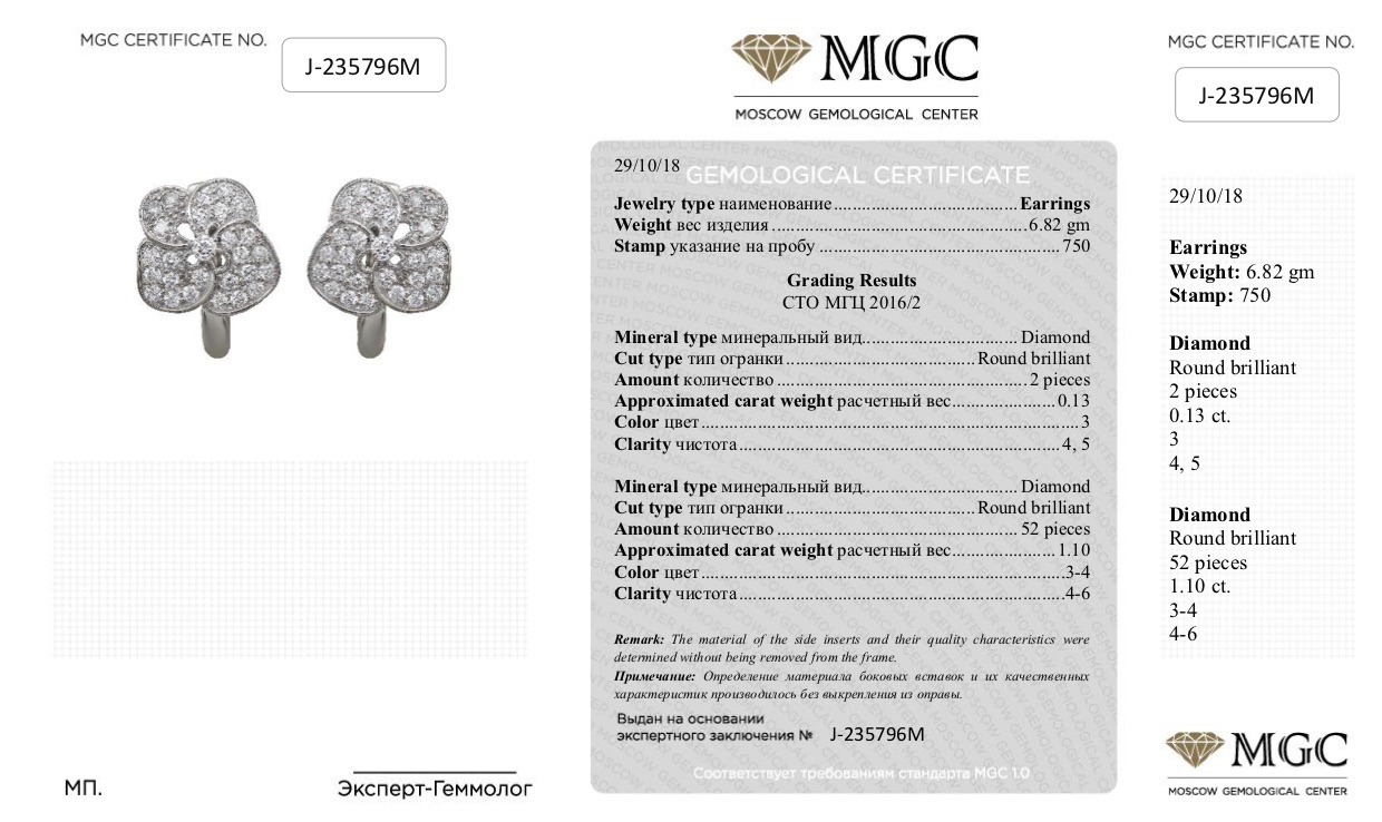 Серьги из белого золота с бриллиантами 1,23 карат (сертификат МГЦ)