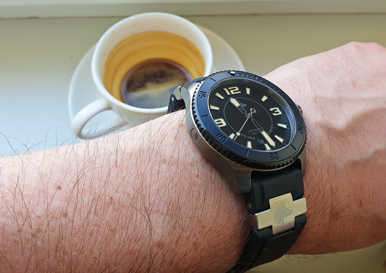 В целом приглушенная черно-серая цветовая гамма, в которой изготовлены часы, с чуть более яркими акцентами часовых меток и стелок, очень согласуется в моем понимании с темой скандинавской мифологии, с темой Севера, холода и сказочной волчьей преданности.