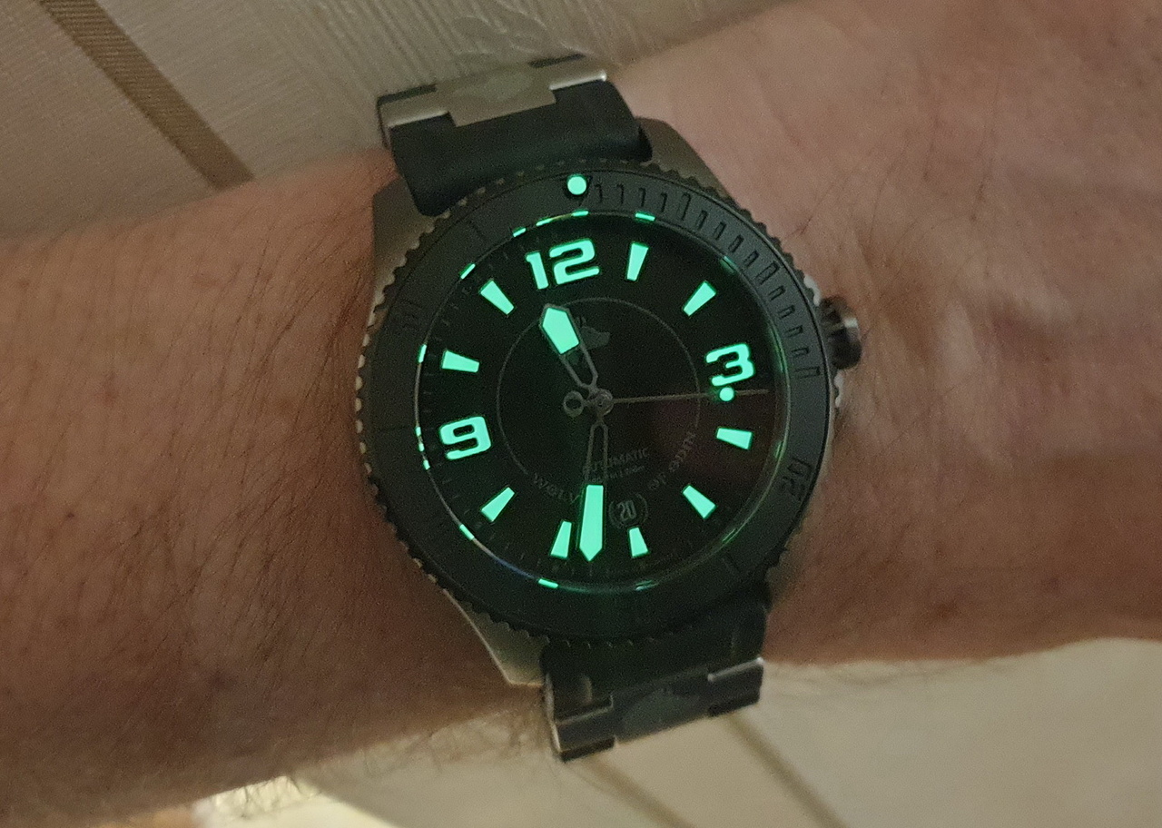Люм на стрелках и метках достаточно яркий, приятного зеленоватого оттенка. Но держится, по ощущениям, не слишком долго, на ночь точно не хватит.