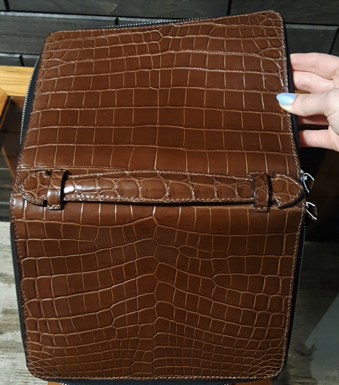 Клатч застёгивается на две металлические молнии от знаменитой швейцарской марки "RiRi", с бегунками из кожи крокодила коричневого цвета.