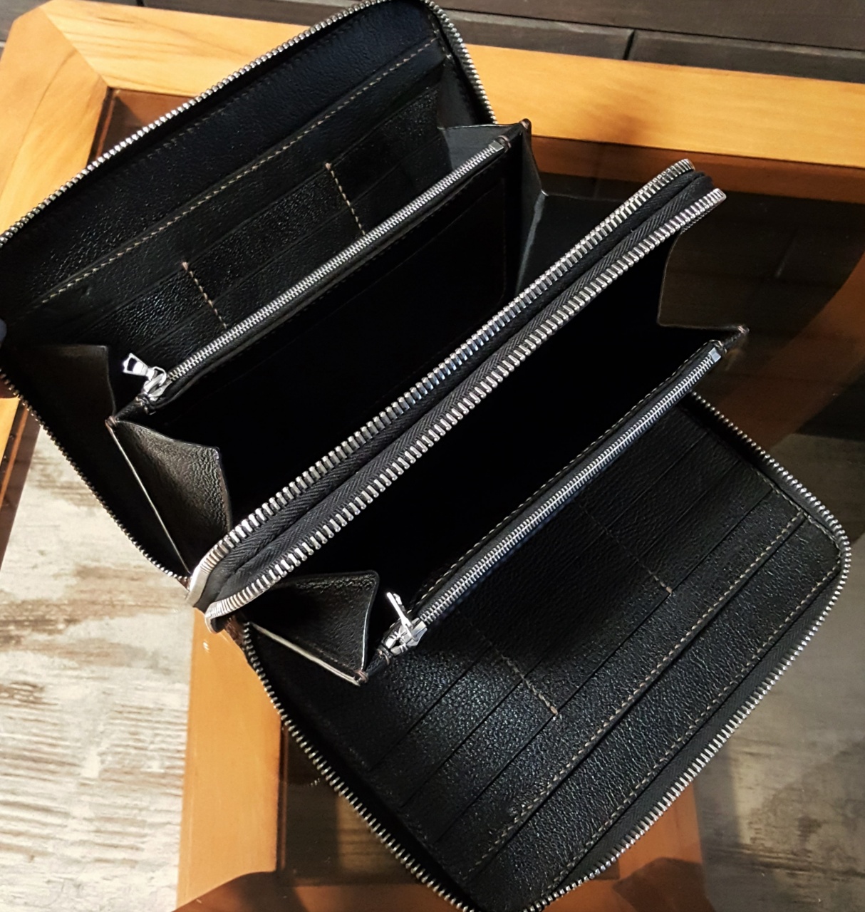 Внутри клатч отделан кожей чёрного цвета, и имеет два вместительных отсека, первый из которых распашного типа имеет вместительное отделение для пачек банкнот (евро, доллары, рубли), с внешним карманом для небольших документов, и дополнительным отделением для монет, два дополнительных отделения для документов, 18 отделений для кредитных карт или визиток, и петличка для шариковой ручки; второй отсек имеет два вместительных отделения пачек банкнот (евро, доллары, рубли) или смартфонов, центральное отделение на молнии для монет, два дополнительных отделения для небольших документов, 18 отделений для кредитных карт или визиток, два отделения для паспорта, водительских прав и других документов.