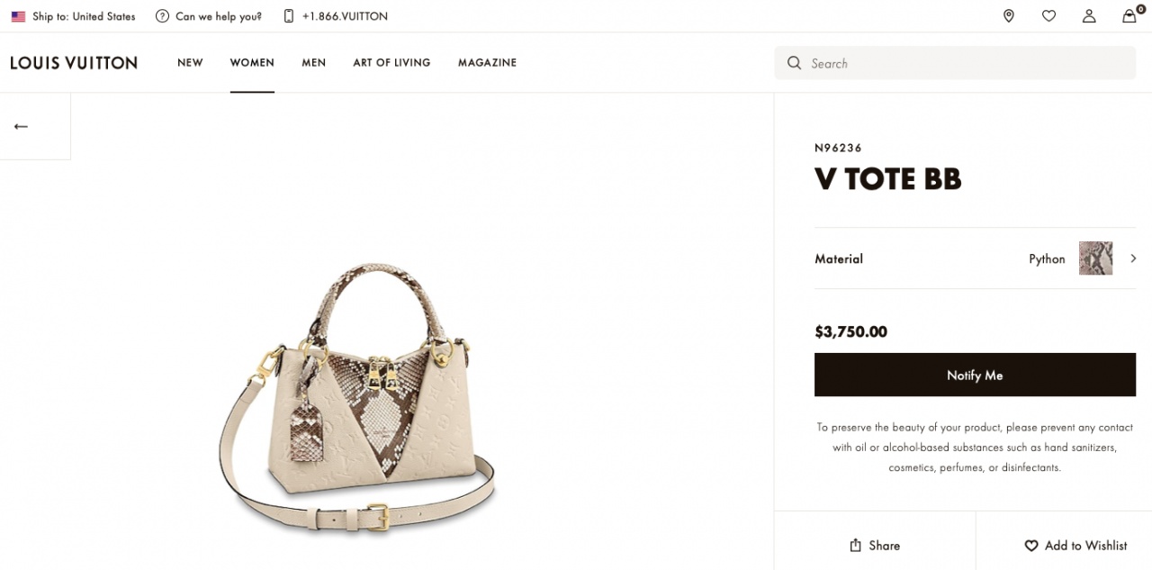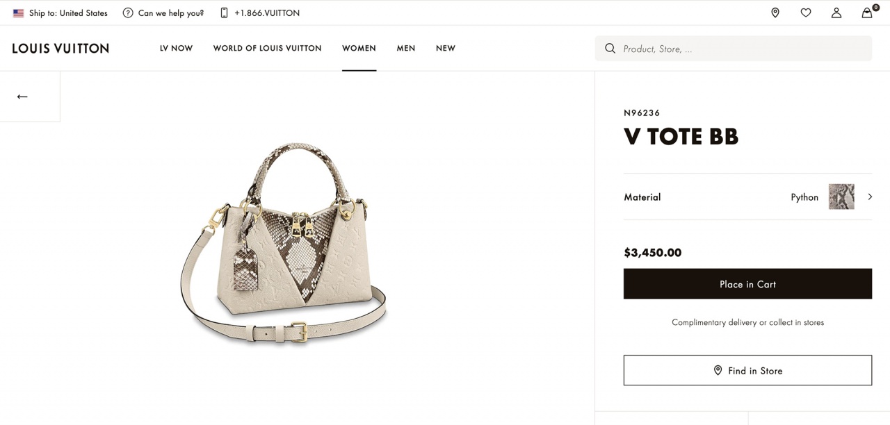 "Легендарный инициал V послужил основой дизайна сумки V Tote. Модная модель отличается уникальным треугольным элементом в форме буквы V, ставшим основой ее выразительного и современного дизайна. Сумка V Tote BB из капсульной коллекции 2019/2020 выполнена в особо шикарной версии - из тиснёной кожи Monogram Empreinte и роскошной кожи питона. Мягкие нюансы окраса натурального питона и особого кремового бежевого цвета кожи Monogram Empreinte, подобранного с особым вкусом специально для этой коллекции, создают безупречный образ женственности и утонченности. Модель великолепно дополнит как дневной, так и вечерний образ. Двойные ручки Toron и съёмный плечевой ремень обеспечивают комфорт при ношении и придают универсальность. Сверкающая фурнитура золотистого цвета и багажная бирка в стиле традиционных чемоданов Дома Louis Vuitton завершают изысканный дизайн очаровательной модели размера BB".