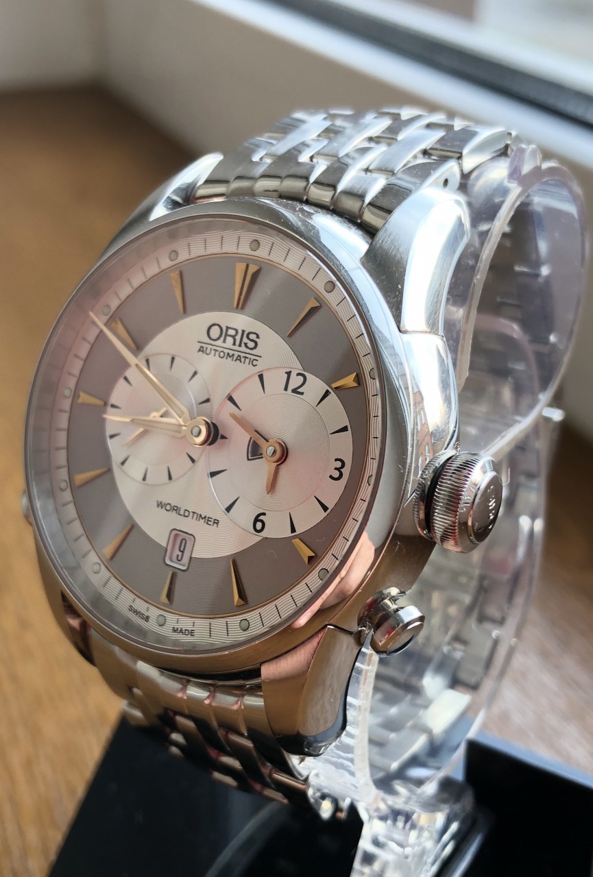 Часы Oris Artelier Worldtimer ( фото именно продаваемых часов ) в отличном состоянии на оригинальном стальном браслете.