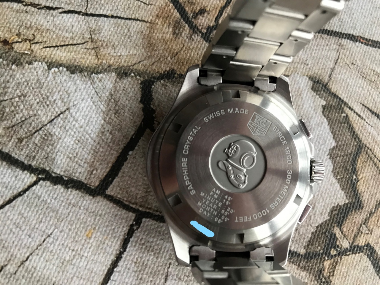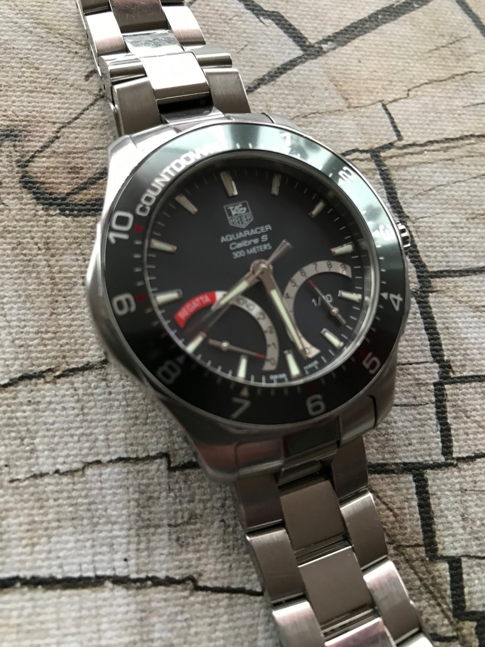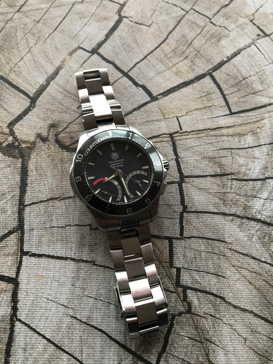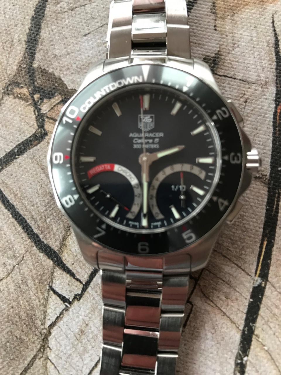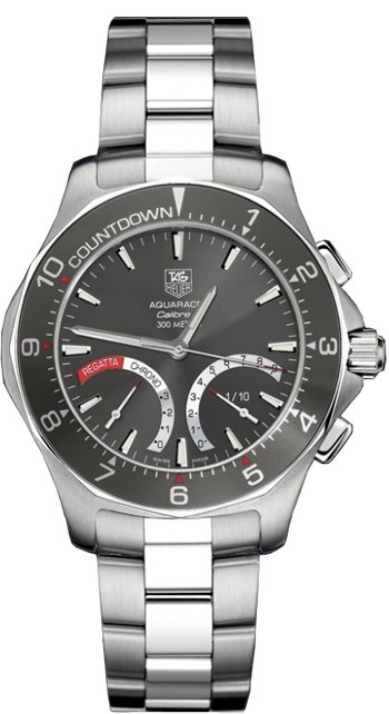 Aquaracer Calibre S Regatta - часы-хронограф с секундомером. Индикация времени и функций хронографа осуществляется с помощью центральных стрелок часов, минут и секунд. Разработанный и запатентованный TAG Heuer эксклюзивный механизм Calibre S, состоящий из 230 механических деталей и 5 двусторонних микромоторов Calibre S обладает уникальными функциями: интуитивная индикация значений хронографа с точностью до 1/10 секунды, измерение простых отрезков времени, промежуточных значений и двух отрезков времени с коротким интервалом между ними, ретроградный указатель даты с вечным календарем вплоть до 2099г., обратный отсчет для регат с возможностью регулировки от -10 до -1 мин, движение стрелок против часовой стрелки в режиме ''РЕГАТА'' с автоматическим включением хронографа по окончании обратного отсчета и началом движения стрелок по часовой стрелке. Переход из одного режима в другой осуществляется простым нажатием на заводную головку. Фиксированный безель со шкалой обратного отсчета (от -10 до -1 мин) для регат. Завинчивающаяся задняя крышка, обеспечивающая герметичность до глубины 300 метров. На задней крышке нанесен узор в виде аквалангиста.