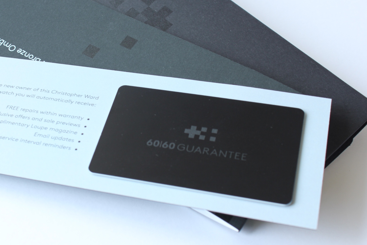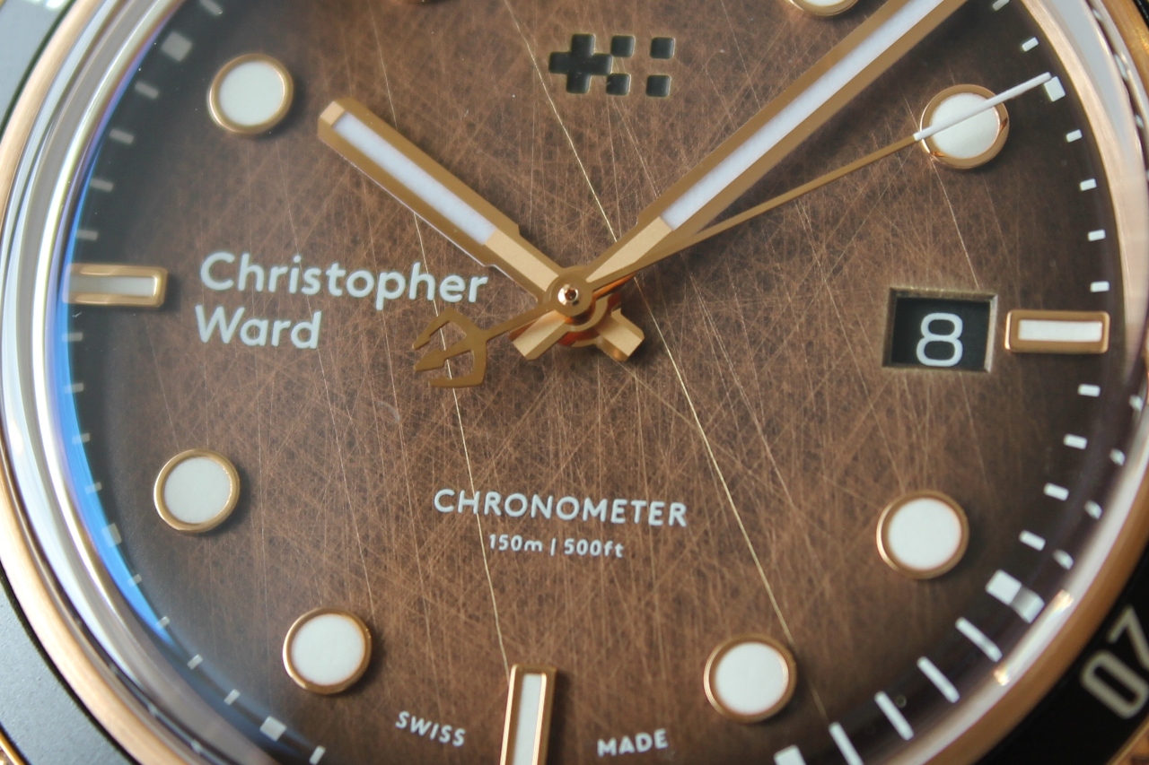 «Твинфлаг» — логотип, символизирующий швейцарский и английский флаги, расположился по центру на 12 часах, текстовое лого «Christopher Ward» — слева на 9-и. Указатель даты — в апертуре, на 3 часах (цвет шрифта белый на черном фоне). Заветная надпись «Swiss made», по всем канонам Федерации швейцарской часовой промышленности, украшает отметку на 6-и часах, чуть выше — информация о водонепроницаемости (150 метров), и гордое «CHRONOMETER».