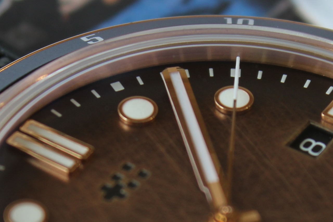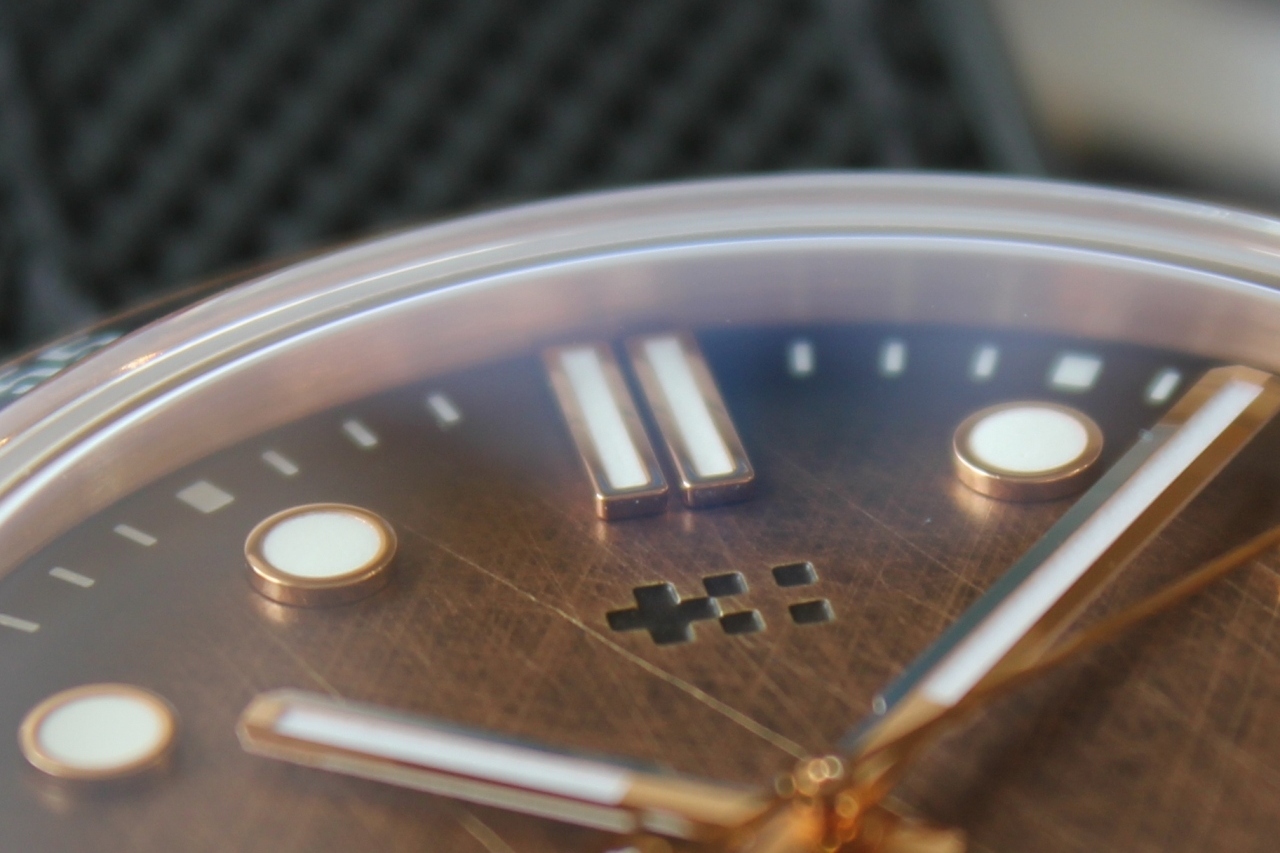 Накладные метки имеют прямоугольную (на отметках 3, 6, 9 и 12 часов) и круглую (на остальных отметках) формы. На 12 часах отметка двойная. Все метки и стрелки имеют зеркальную полировку и позолочены, что хорошо сочетается с цветом бронзы. Сердцевина минутной и часовой стрелок обработана сатинированием Вся эта красота наполнена люмом TC-1 Super-LumiNova.