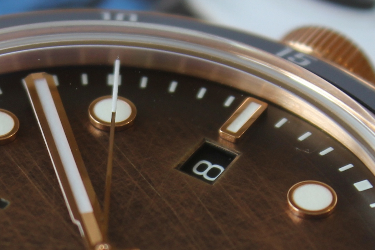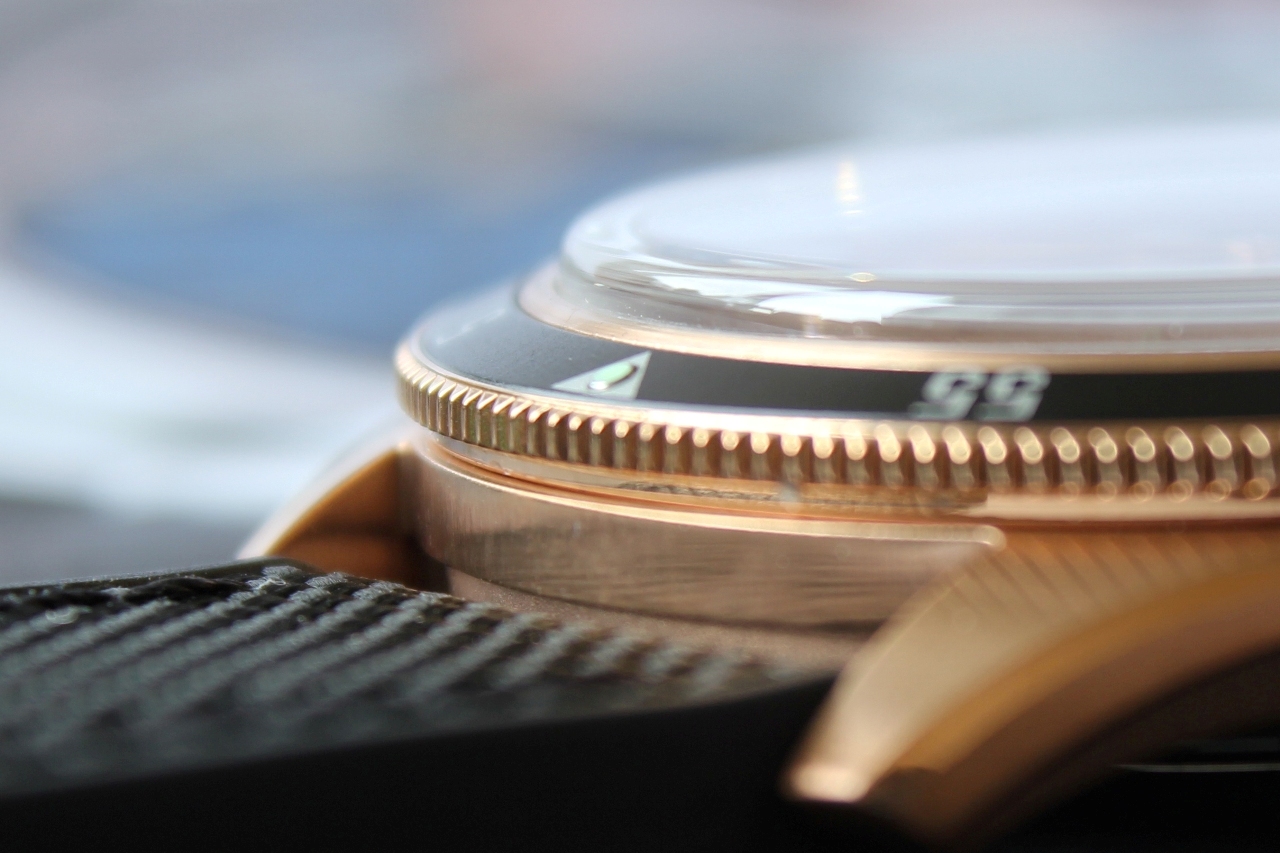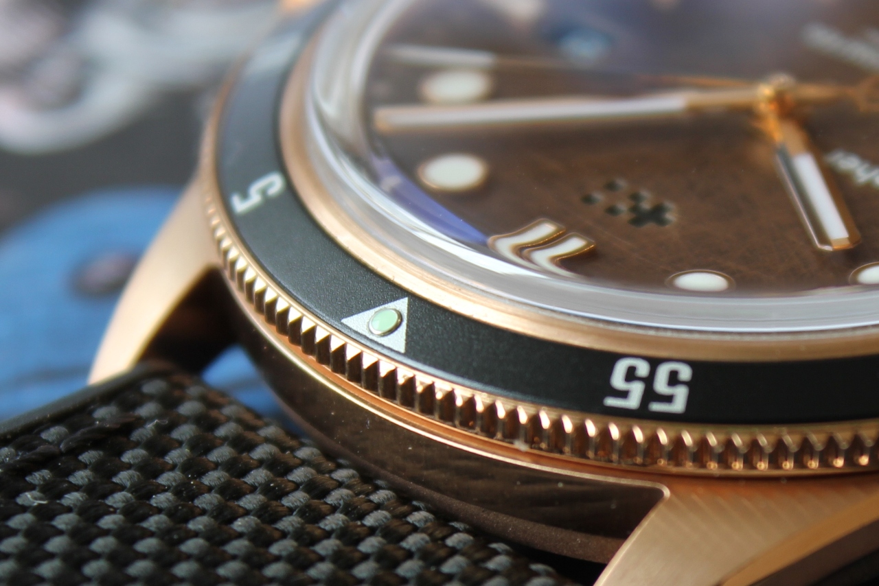 Отдавая должное винтажному стилю вставка безеля изготовлена из анодированного алюминия. Сам безель, вращающийся в одном направлении и имеющий классическую дайверскую разметку, сделан из бронзы. Черный цвет вставки гармонирует с темным краем циферблата и является, так сказать, его «продолжением».