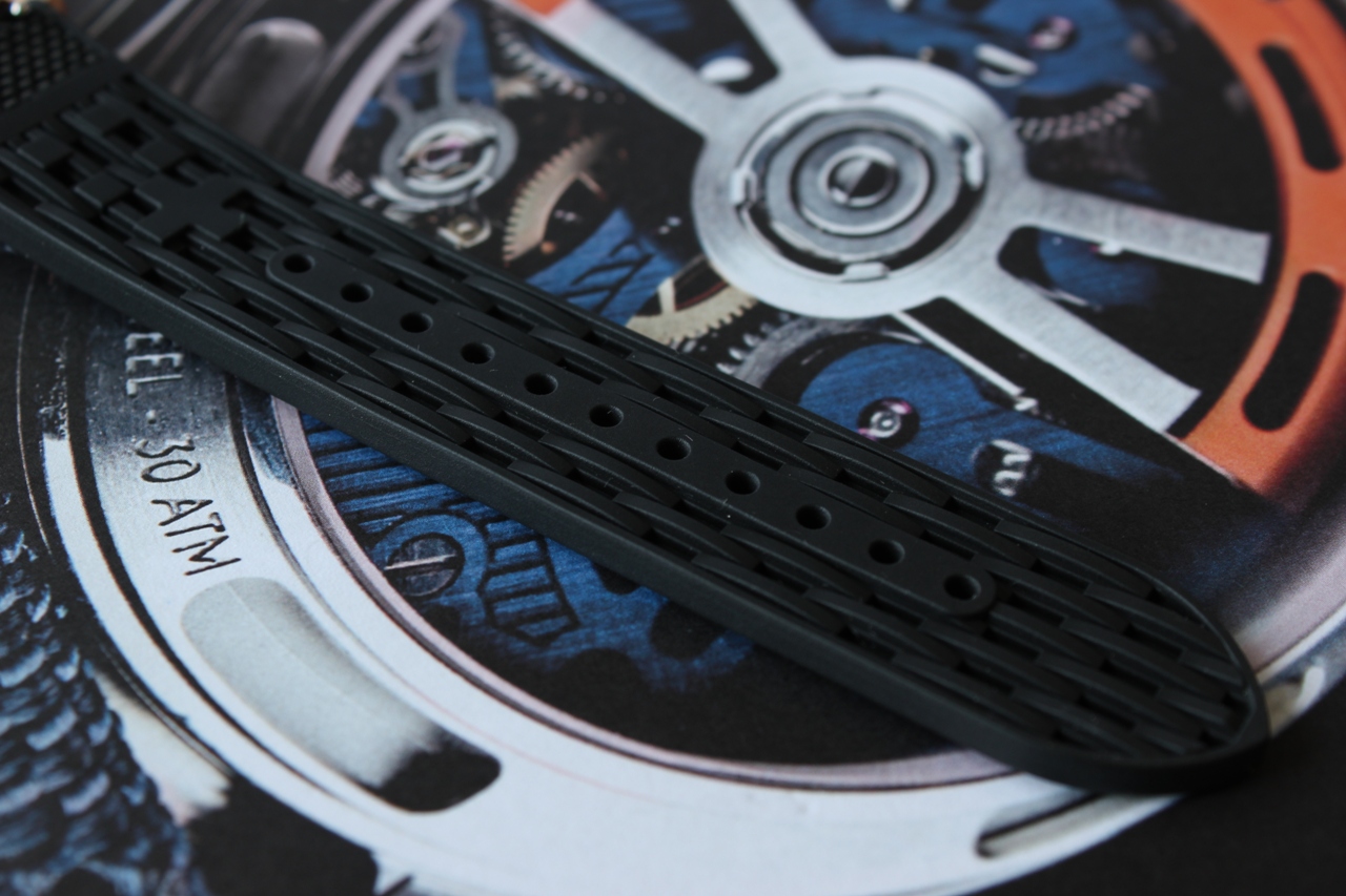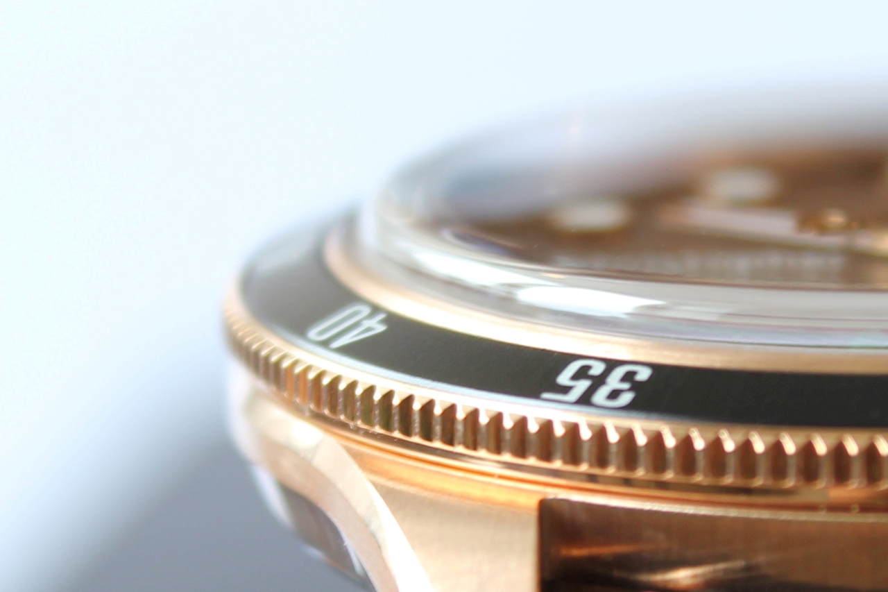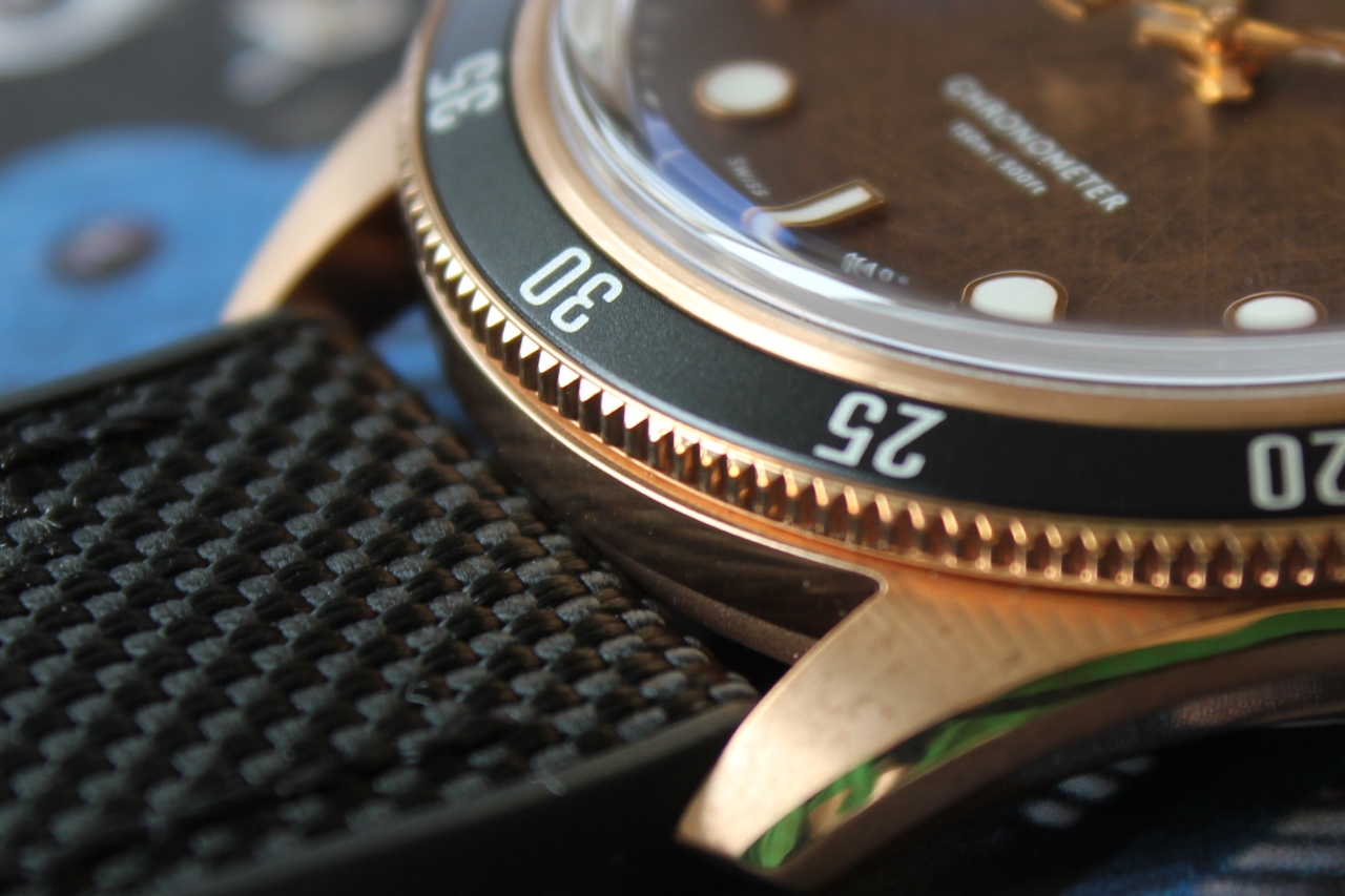 Отдавая должное винтажному стилю вставка безеля изготовлена из анодированного алюминия. Сам безель, вращающийся в одном направлении и имеющий классическую дайверскую разметку, сделан из бронзы. Черный цвет вставки гармонирует с темным краем циферблата и является, так сказать, его «продолжением».