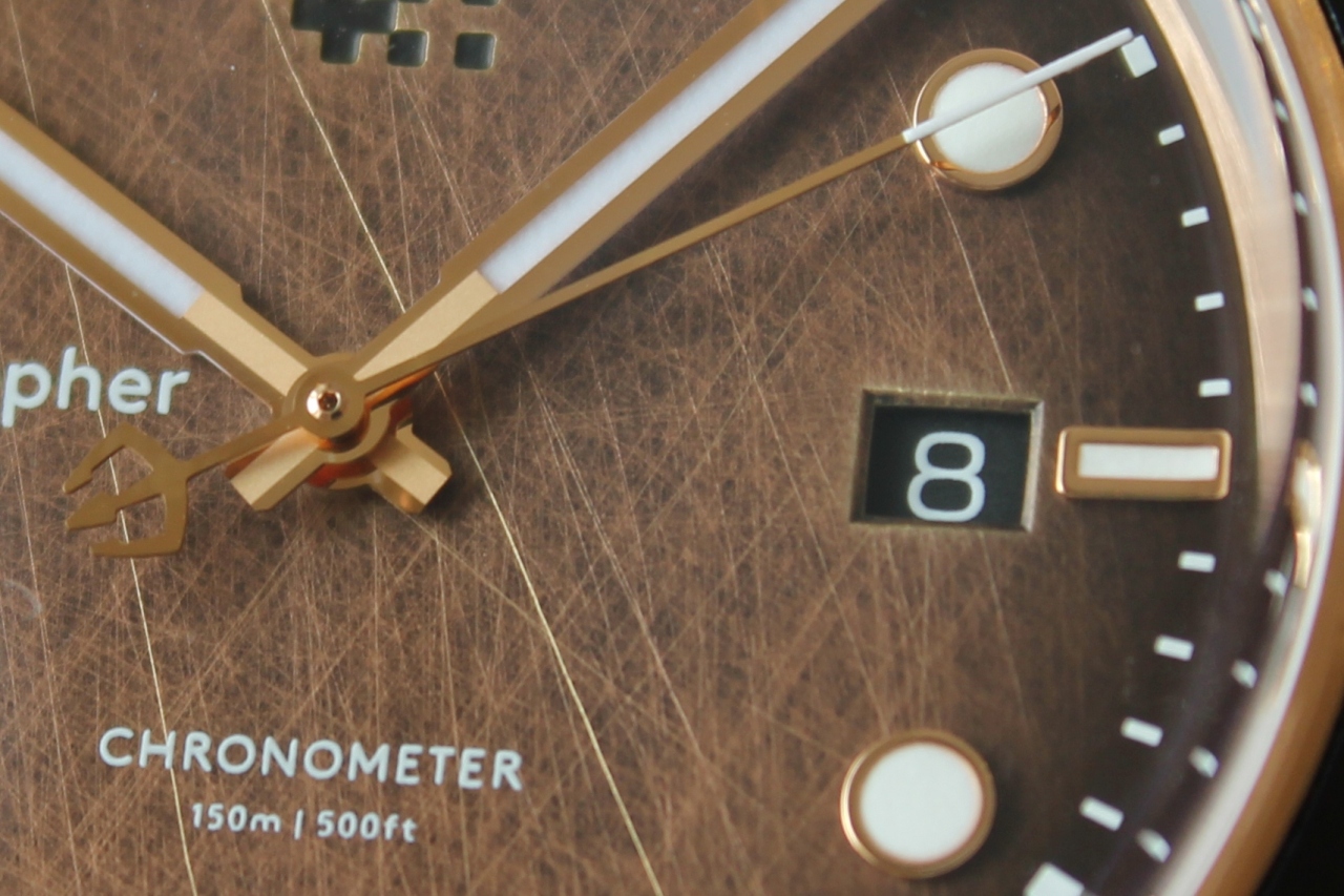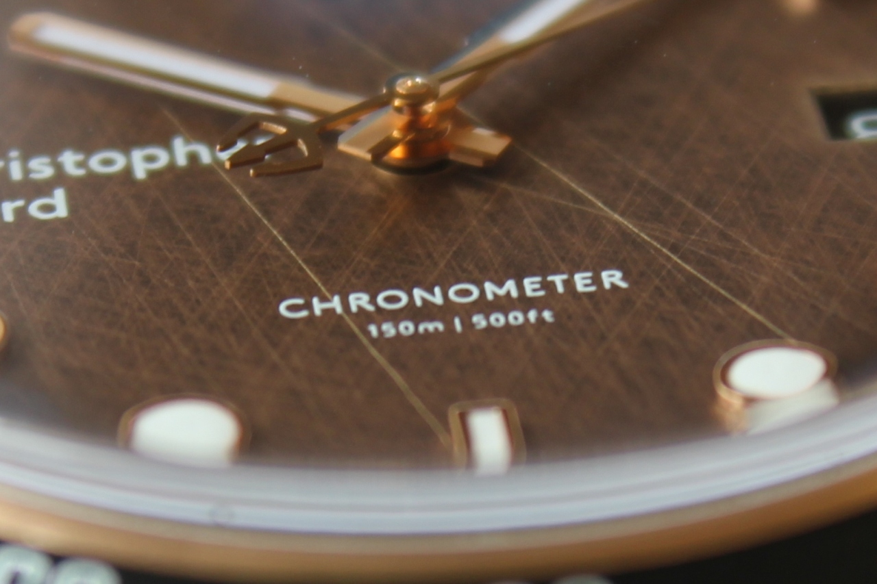Выпуск данных часов, дизайн которых основан на стиле 60-х годов прошлого века, ограничен количеством в 500 экземпляров, каждый из которых будет отличаться от 499-и остальных не только благодаря патинированию. Циферблат часов, так же как и корпус, изготовлен из бронзы C5191 (CuSn6) и имеет уникальный рисунок. Сотни «царапин», аккуратно нанесенных вручную, придают часам неповторимый шарм и свой собственный характер. «Ombré» — именно так дизайнеры Christopher Ward решили назвать этот эффект, что в переводе с французского означает «затенённый», «заштрихованный». И то и другое наглядно продемонстрировано на циферблате: штрихи-царапины и градиент цвета от светлого (в центре) к темному (по краям). Выглядит это, надо сказать, потрясающе.