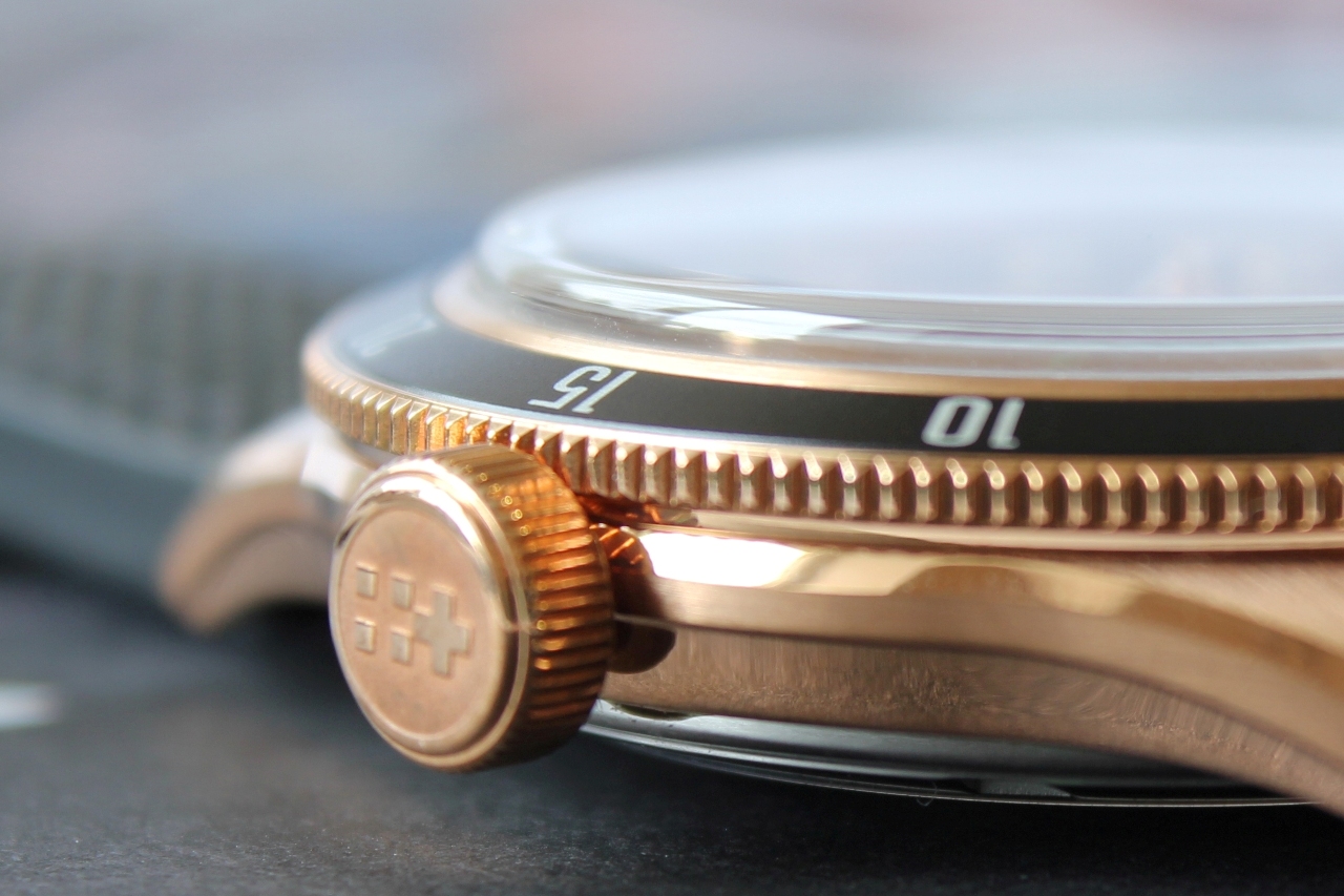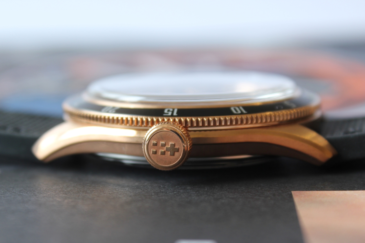 Бронзовая заводная головка, на которой так же красуется «твинфлаг», не завинчивается, что для герметичности в 15 атмосфер — редкость.