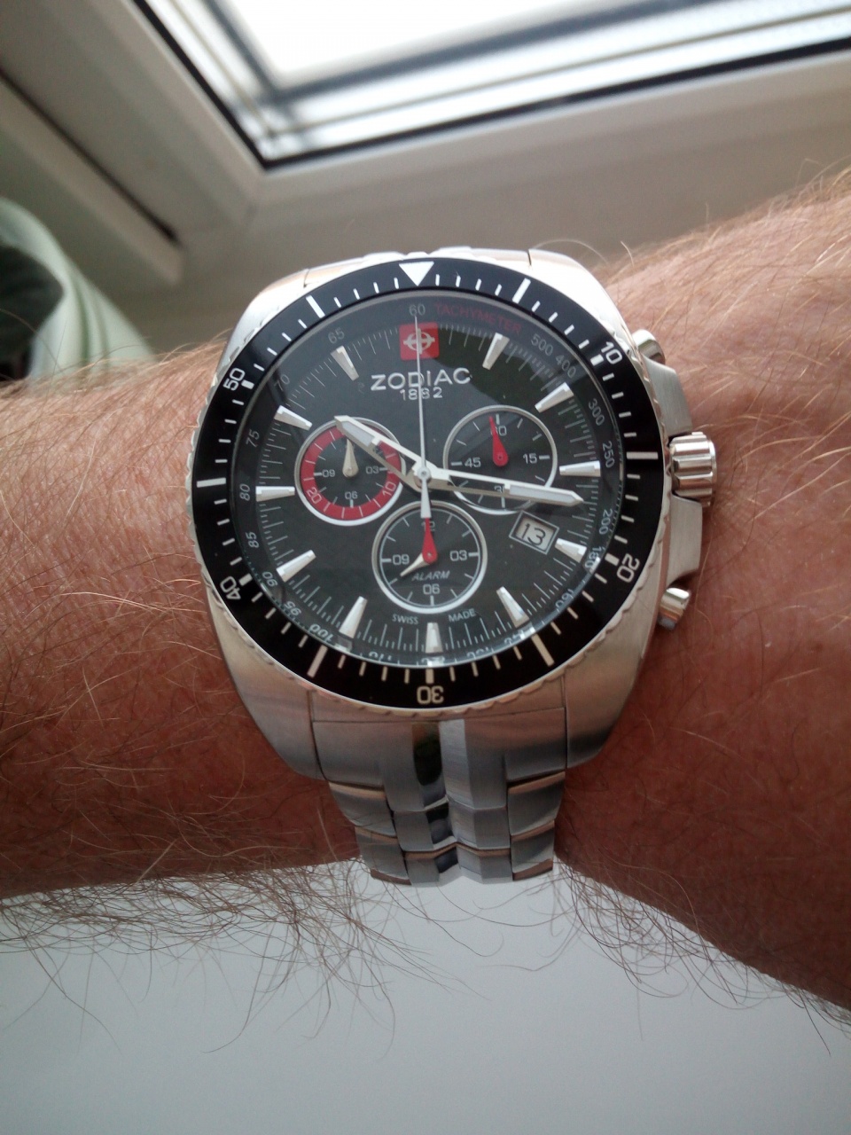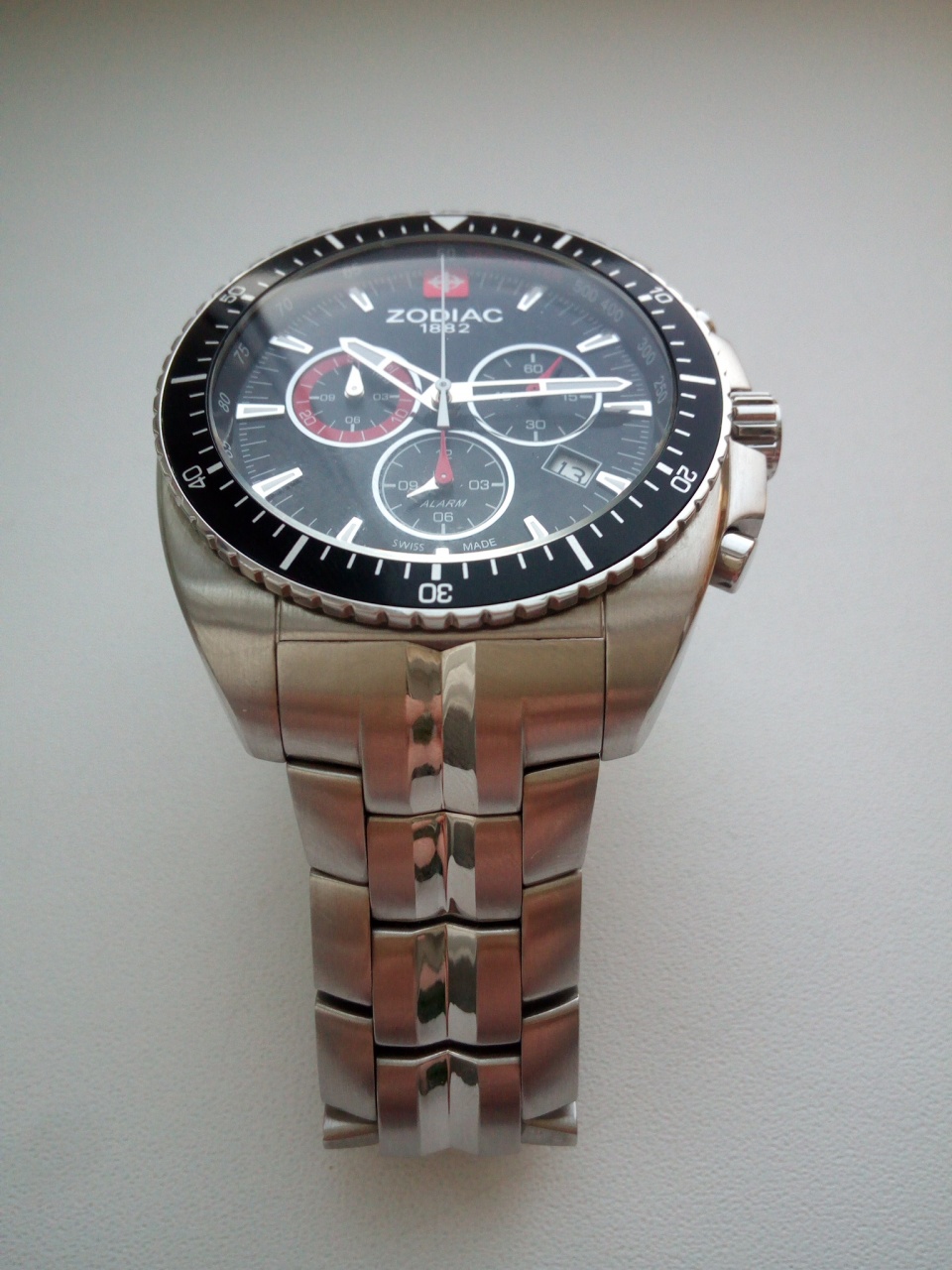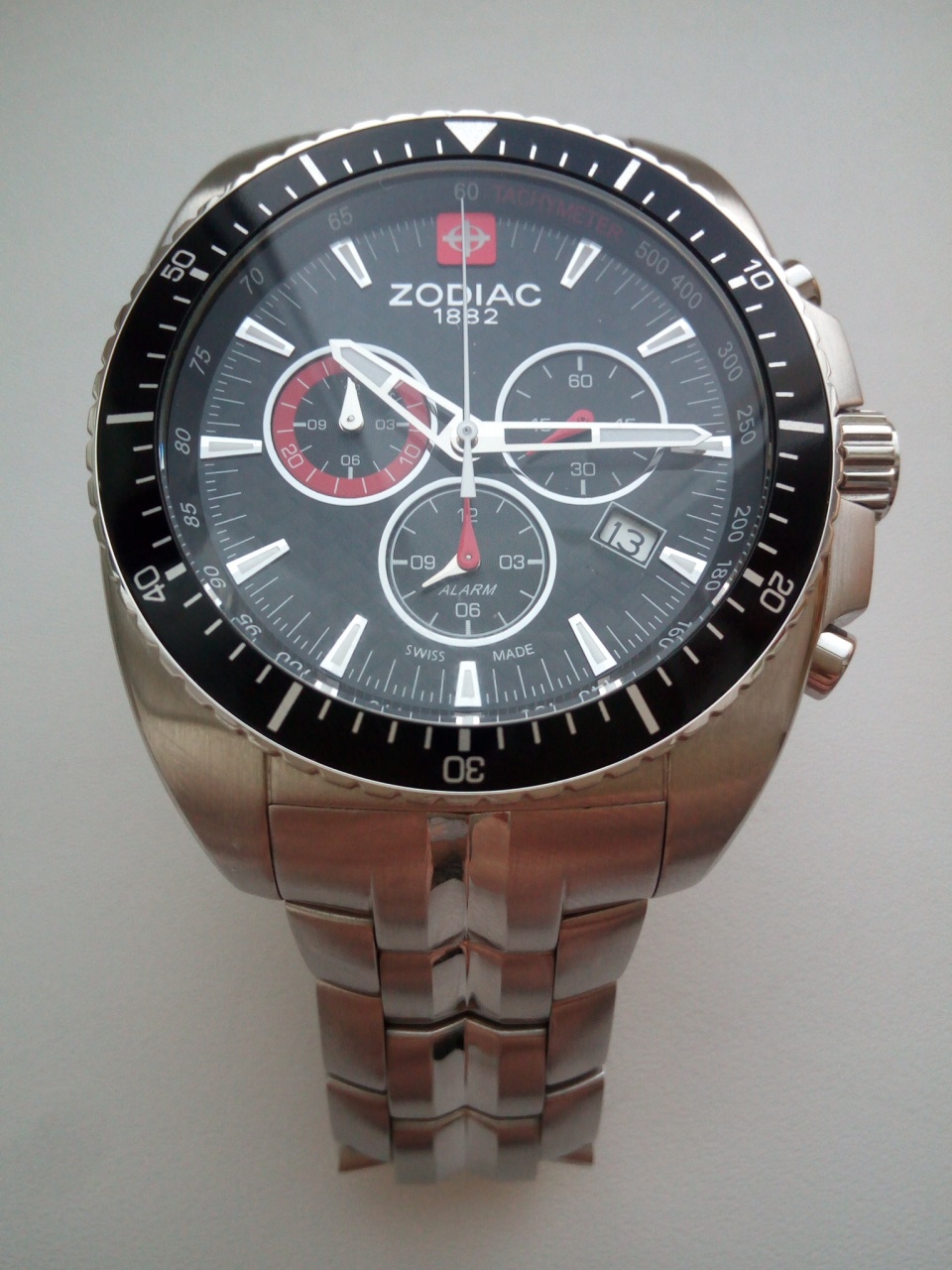 Дата на 4 часа, манеж секунды на 3 часа, манеж хронографа (минута/час) на 9 часов, манеж будильника (час/минута) на 6 часов