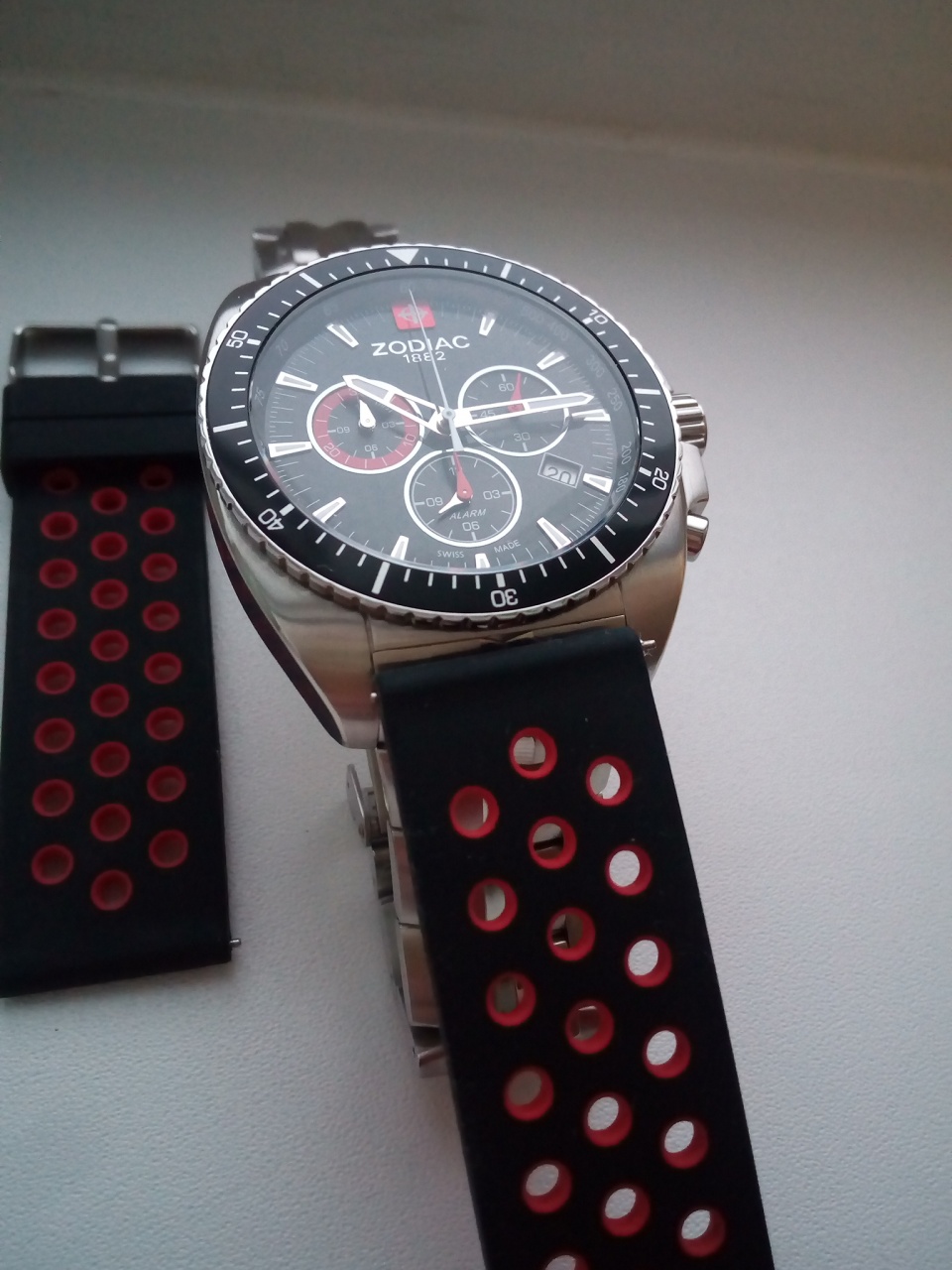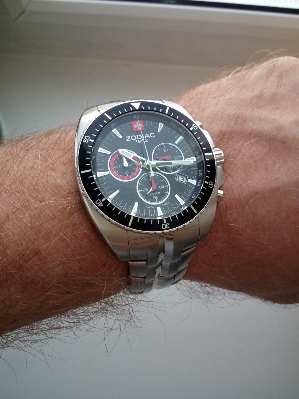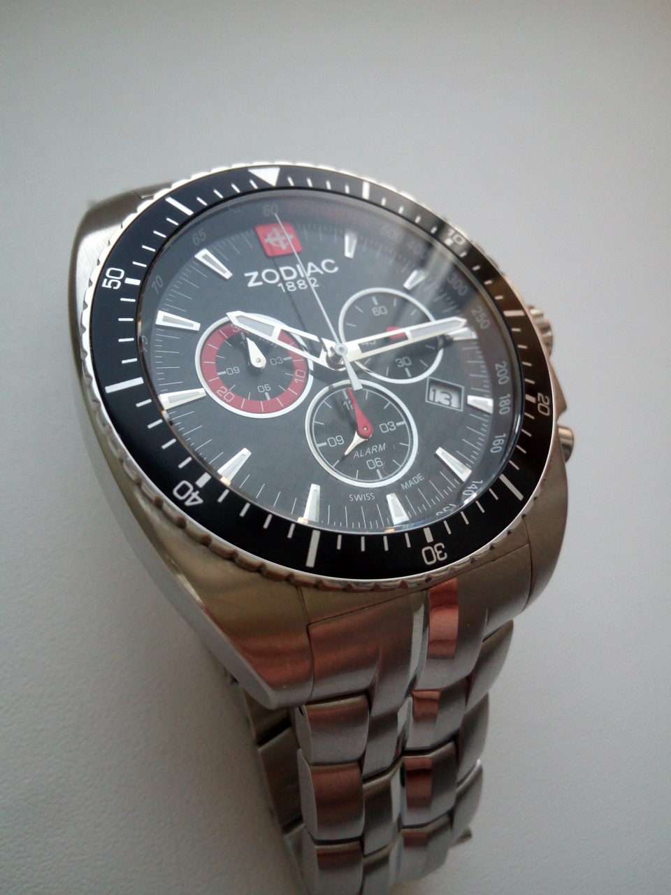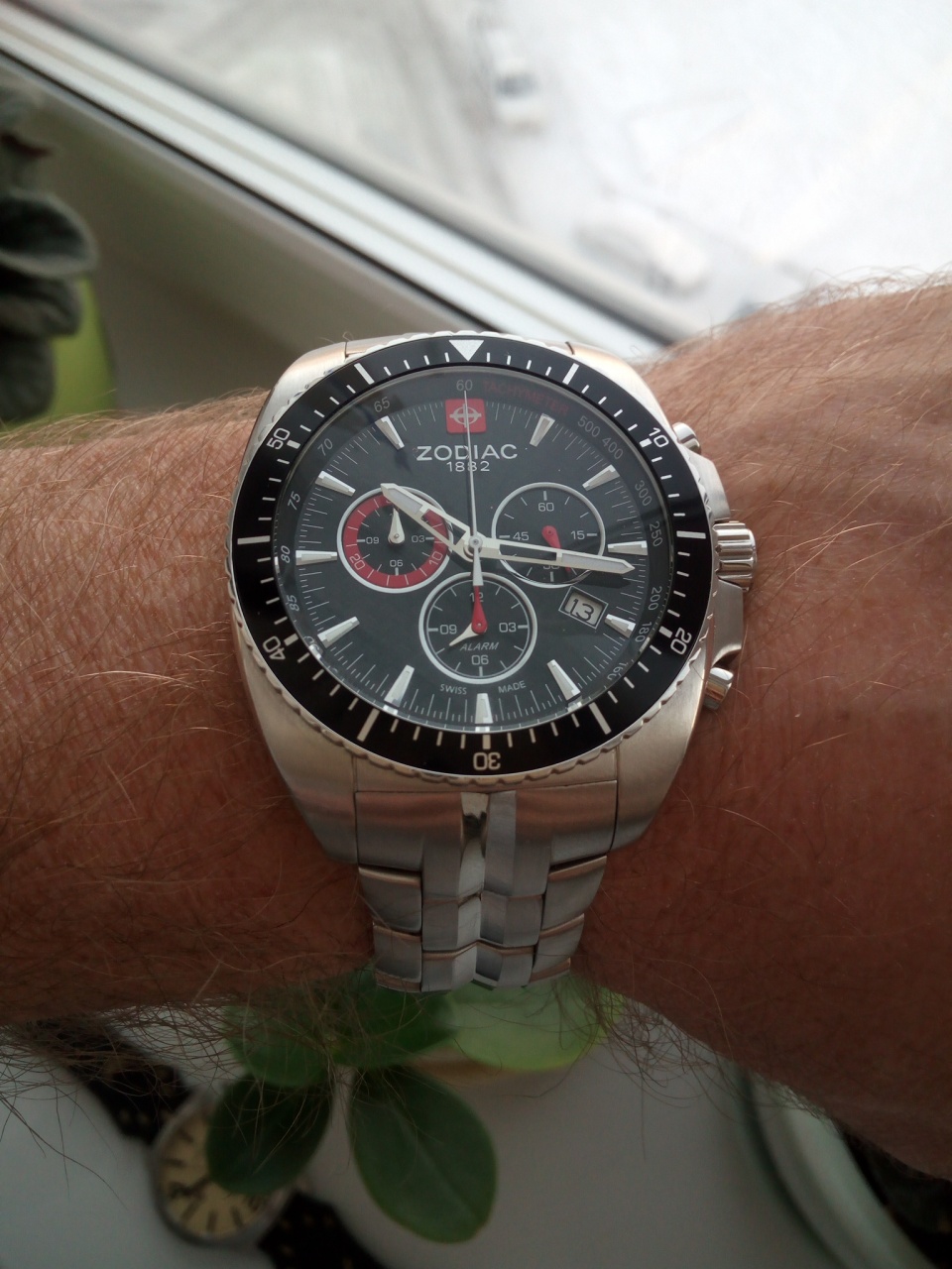 Дата на 4 часа, манеж секунды на 3 часа, манеж хронографа (минута/час) на 9 часов, манеж будильника (час/минута) на 6 часов