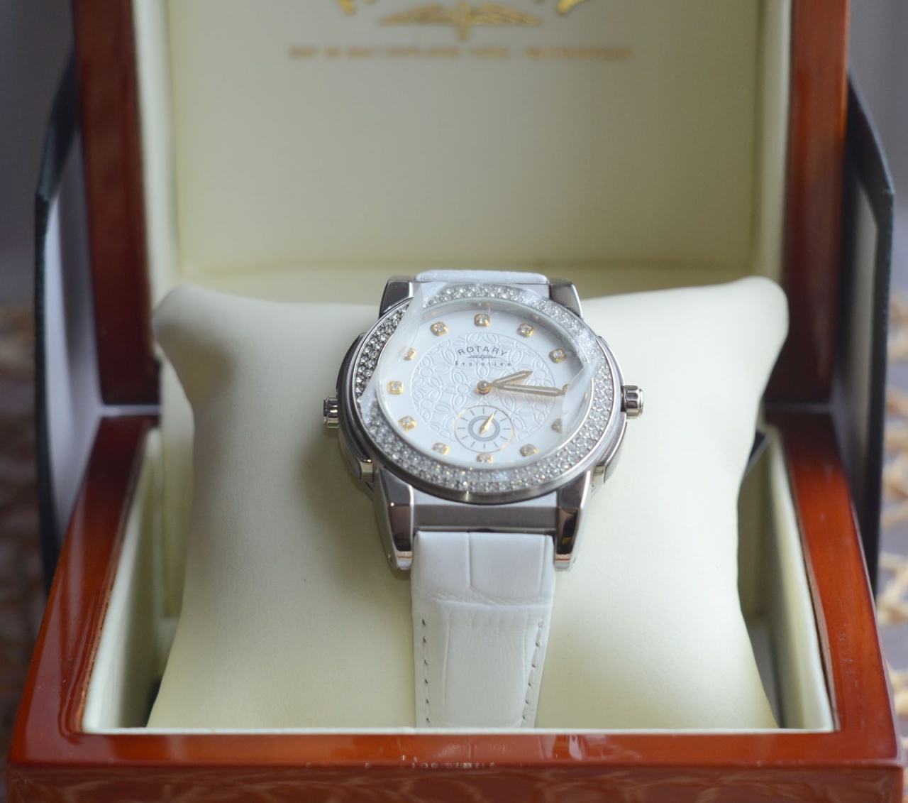 и малым секундным циферблатом. Часовые метки и безель украшены кристаллами Swarovski.