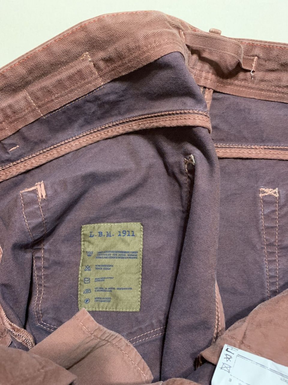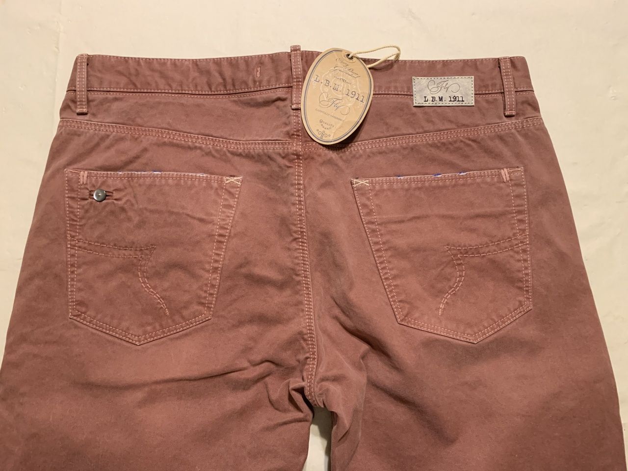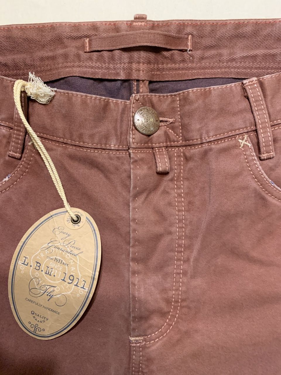 Продаются новые мужские брюки джинсового кроя итальянскогo бренда L.B.M. 1911 (Luigi bianchi mantova, семейная компания со столетней историей, высоко котирующаяся в Италии) дизайнерская модель ,искусственно состаренные, c элементами ручной работы,флагманская модель , превосходного исполнения, плотная ткань, цвет светло-кораллового цвета, логотип, классическая посадка на талии, застегиваются на пуговицы с логотипом бренда, множество карманов, прямой крой брюк, ширина низа брючин 18 см, состав: 100% хлопок, все бирки и запасная фурнитура прилагаются, гарантированный 100% оригинал, размер 52(IT), производство Италия