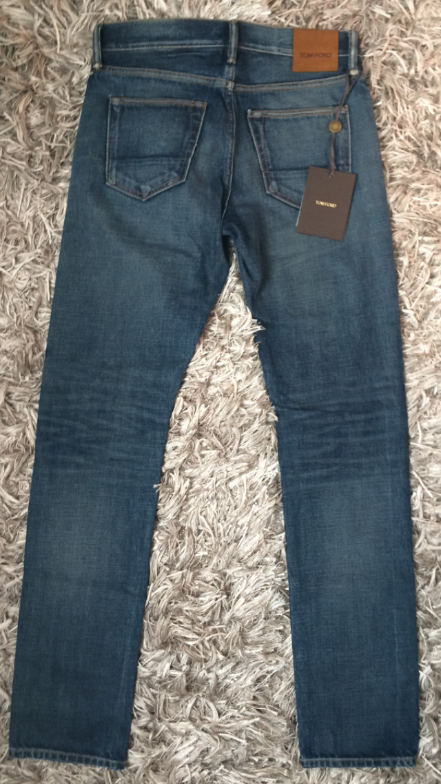 В продаже,новые мужские джинсы от американской люкс-марки TOM FORD.Джинсы прямого кроя(STRAIGHT),слегка зауженные книзу,изготовлены из высококачественного,мягкого хлопка с искусственно созданными заломами и потёртостями.Имеют контрастную светло-коричневую прострочку,застёжку на брендированные пуговицы-клёпки серебристого цвета,сзади на поясе традиционный ярлык с названием бренда,выполненный из тёмно-жёлтой замши.