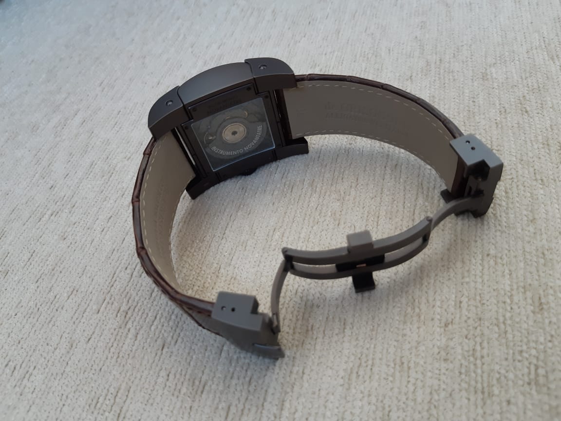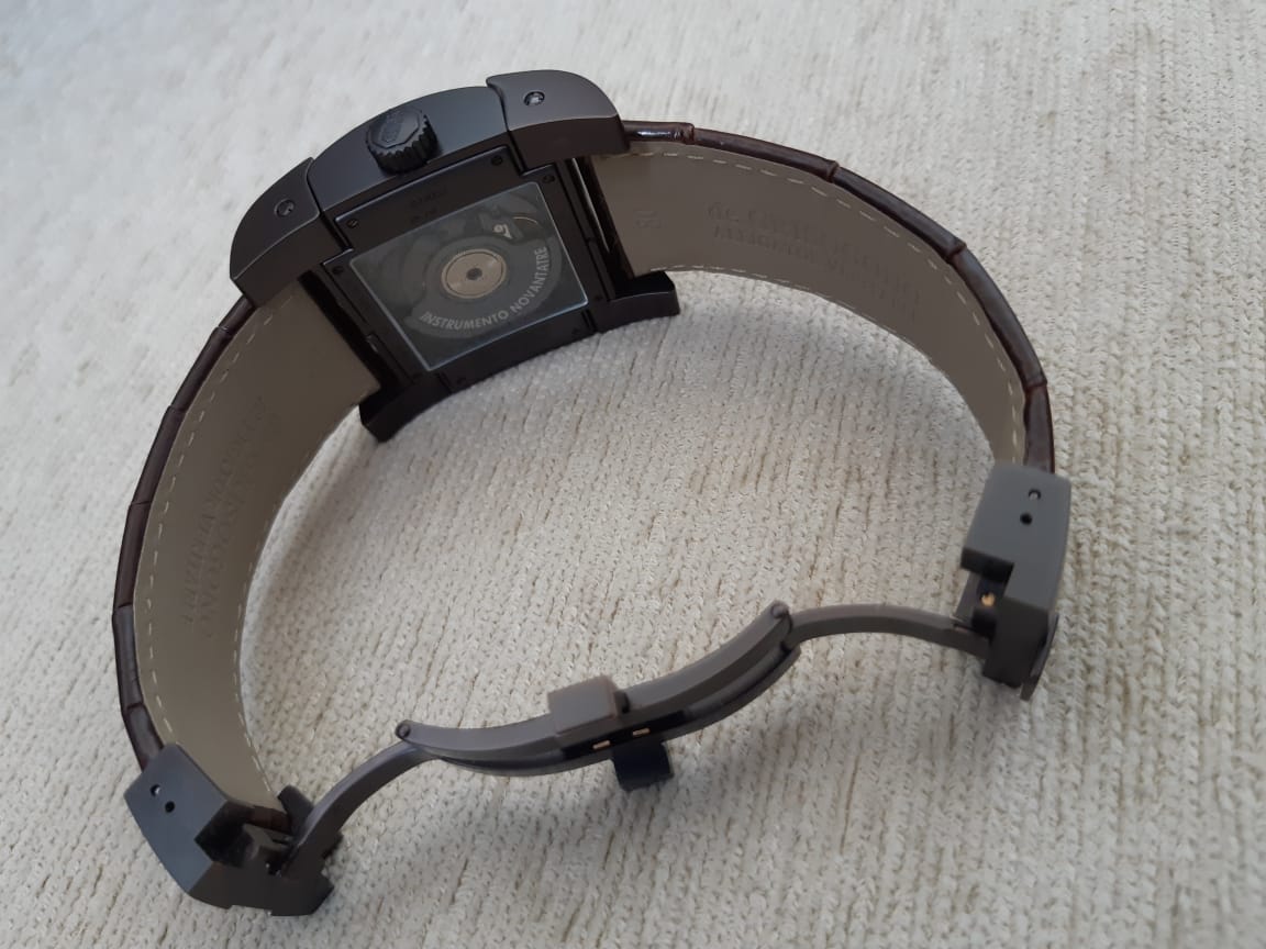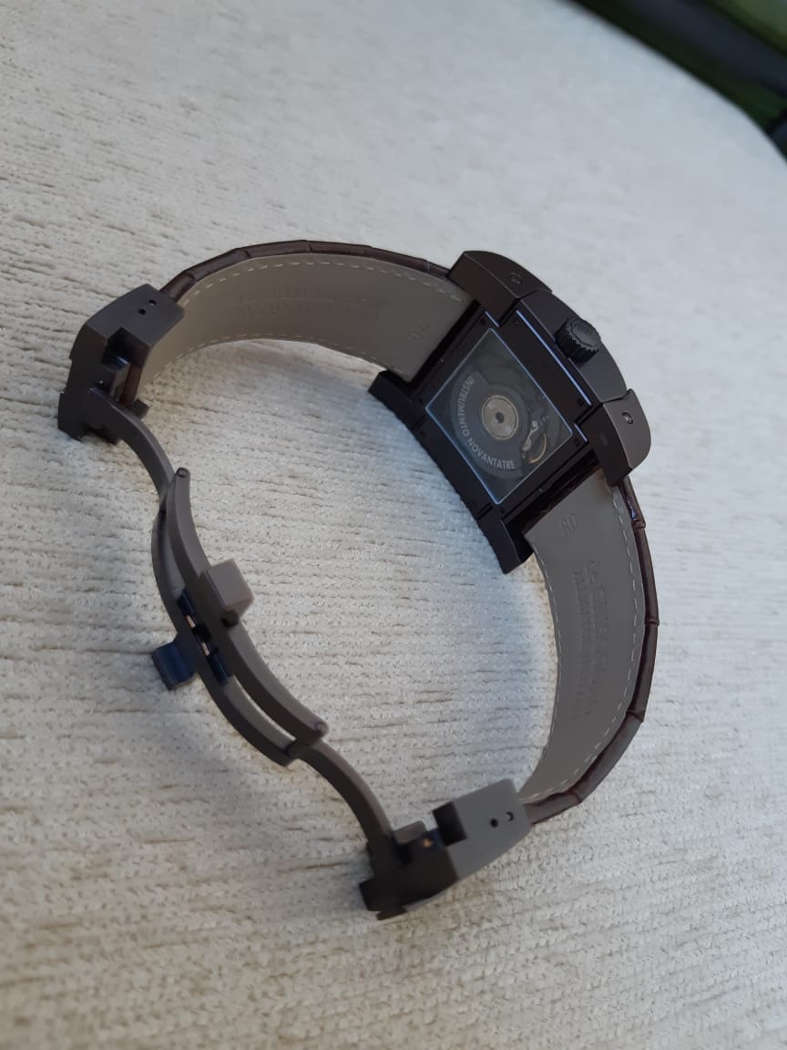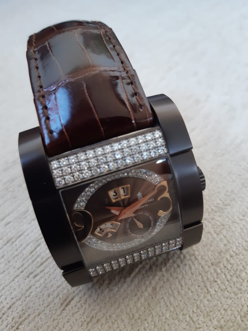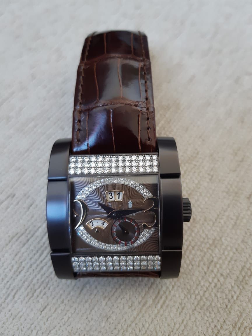 • Корпус: «Browny Brown Gold», розовое золото 18K, покрытие PVD – запатентованная технология, украшен 78 бриллиантами (~1.79ct), форма каре с анатомическим изгибом, ушки на шарнирных петлях; заводная головка из золота; задняя крышка с сапфировым окном на 6 винтах.