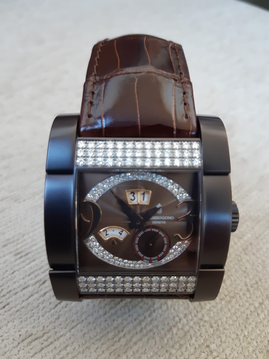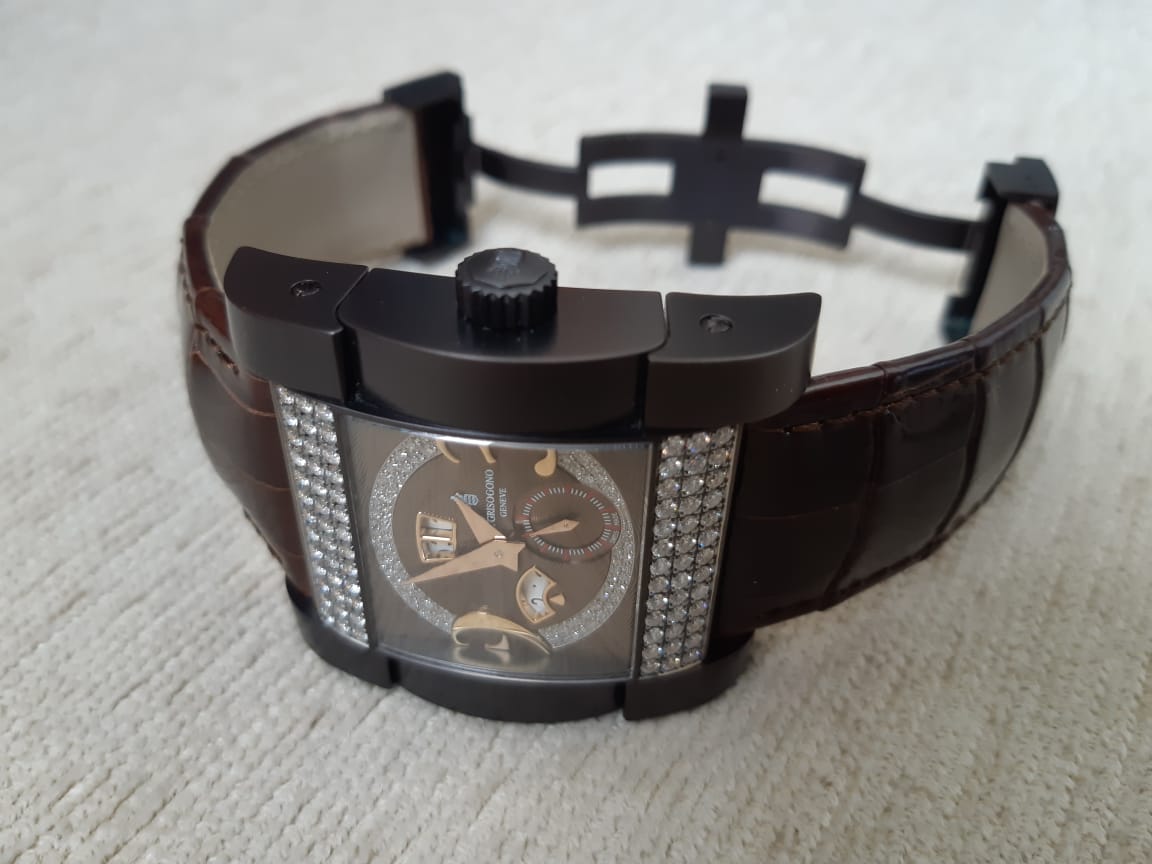 • Механизм: Механика с автоподзаводом, de Grisogono QA 20-89, запас хода 43 часа. Вороненые мосты и платина, гравированный ротор.