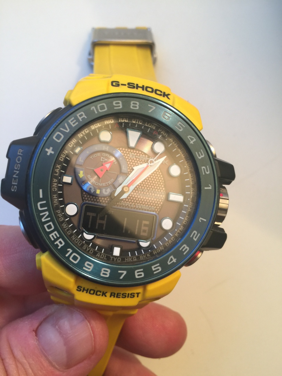 Питание от солнечной энергии, индикатор заряда батареи. Циферблат и ЖК-дисплей подсвечиваются светодиодом, при недостаточном освещении во время поворота запястья в сторону лица подсветка включается автоматически. Светонакопительное покрытие необрит продолжает светиться в темноте даже после непродолжительного пребывания на свету. Противоударный корпус защищает механизм от ударов и вибрации. Функция автоматического сохранения энергии. Время работы аккумулятора без подзарядки - 6 месяцев, при включенной функции сохранения энергии - 23 месяца. Коррекция текущего времени радиосигналом на территории почти всей Европы, США, Японии и Китая. Встроенный цифровой компас. Высотомер - встроенный датчик барометрического давления с возможностью вывода результатов в единицах высоты над уровнем моря (от -700 до 10000 метров). Барометр - измерение атмосферного давления от 260 до 1100 гПа (от 195 до 825 мм рт. ст.). Встроенный датчик температуры от -10° до +60°С с точностью 0,1°C. Отображение возраста и фазы Луны. Графическое отображение сведений о приливах и отливах. Система Smart Access с помощью электронной заводной головки обеспечивает простой и удобный доступ ко всем важным функциям часов. Нажатие или поворот заводной головки позволяет переключаться между различными режимами и активировать будильник, таймер, секундомер, а также настраивать функцию мирового времени. Секундомер с точностью показаний 1/100с и временем измерения 24ч. Сплит-хронограф. Таймер обратного отсчета от 1с до 1ч. Мировое время. 12-ти и 24-х часовой формат времени. Функция отключения/включения звука. Заводная головка с защитой.