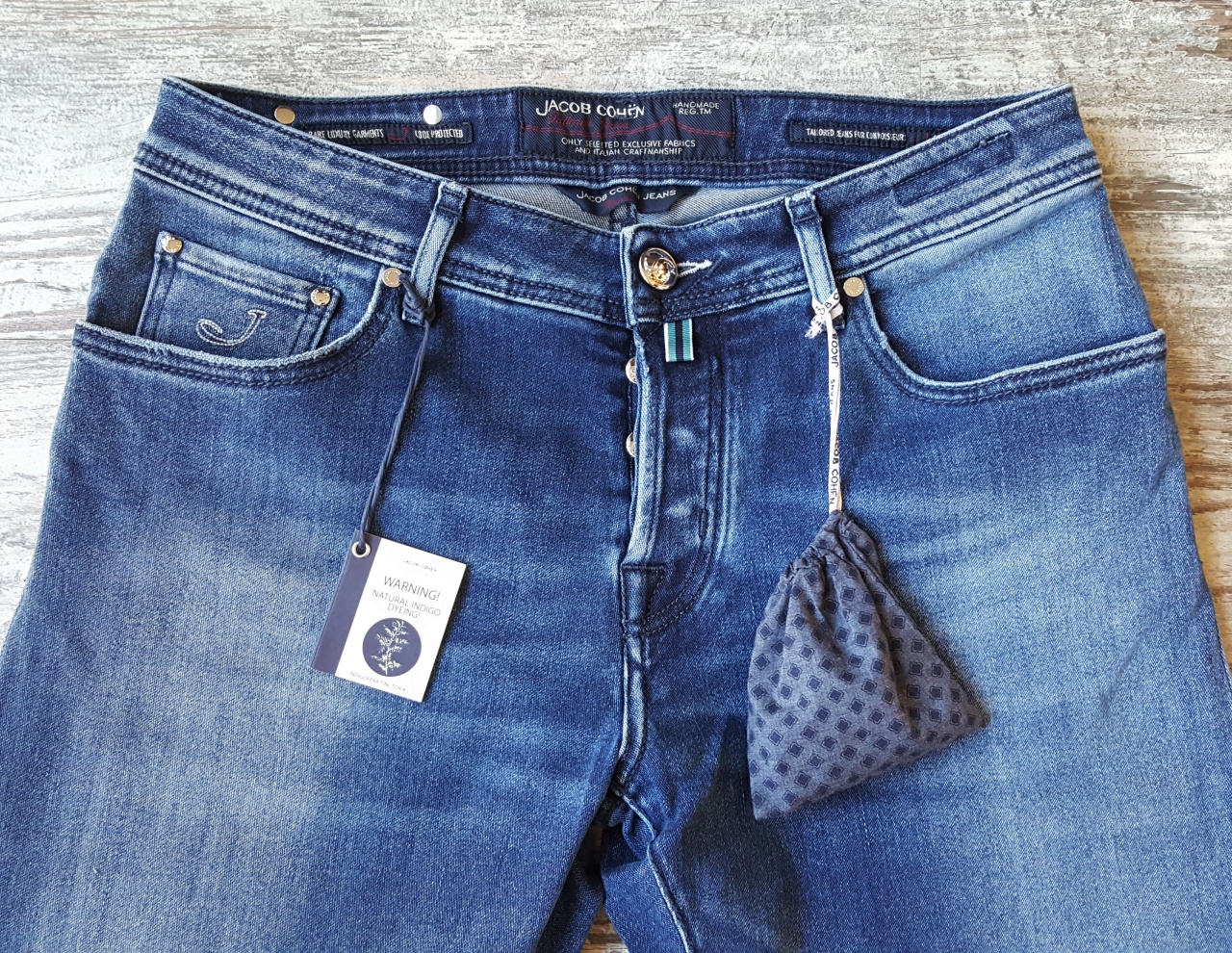 Сзади на правом бедре джинсы имеют фирменный ярлык из натуральной кожи игуаны серого цвета с логотипом из серебра марки Jасоb Соhеn.