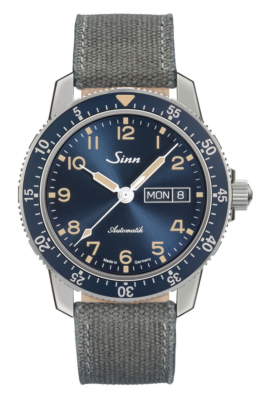 Новинка имеет круглый корпус, изготовленный из нержавеющей стали, диаметром 41,0 мм, толщиной 11,5 мм, водонепроницаемый до 200 метров. На передней стороне корпуса размещен вращающийся двунаправленный безель с синей алюминиевой вставкой. На торце крупной рифленой защищенной завинчивающейся заводной головки, расположенной на 3 часах, выгравирован логотип бренда Sinn. Сапфировое стекло установлено на лицевой стороне корпуса (с антибликовым покрытием) и на его завинчивающейся задней крышке. Синий циферблат с лучистой отделкой, арабскими цифрами, часовыми индексами и стрелками, покрытыми люминесцентным составом бежевого цвета.