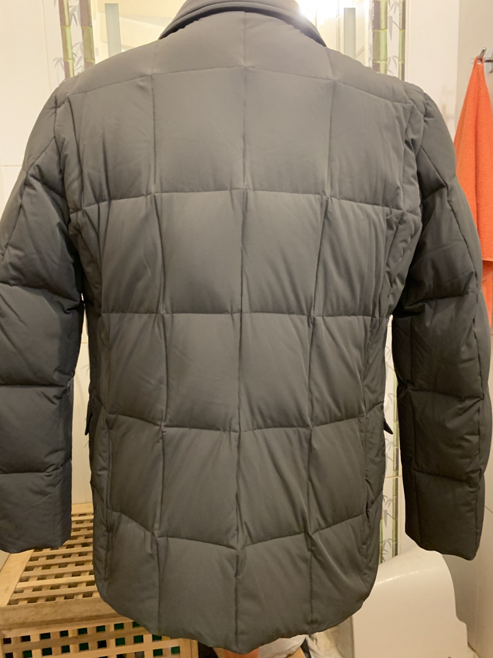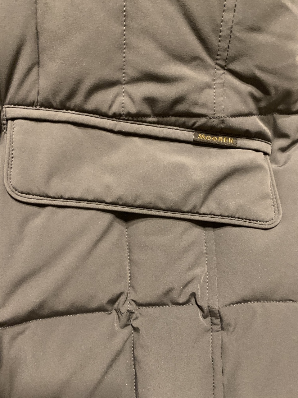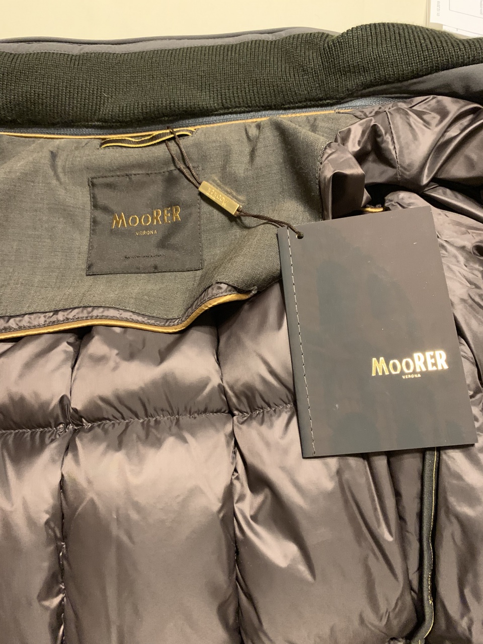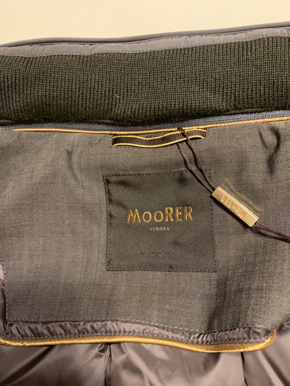 Продается новый мужской пуховик, стилизованный под пиджак, бренда MOORERпревосходного исполнения, цвета кофе с молоком, однобортная модель с лацканами, из водоотталкивающей ткани, ветрозащитная вставка на молнии, логотип, застегивается на пуговицы с логотипом бренда, два наружных кармана с клапанами, два внутренних кармана на молнии и пуговице с логотипом бренда, внутри пух, соответствующий евростандарту - соотношение пуха и пера 95/5, рассчитан на температуру до -26 градусов, состав: 88% полиамид, 12% полиуретан,, все бирки и запасная фурнитура прилагаются, гарантированный оригинал, размер 56(IT), производство Италия.