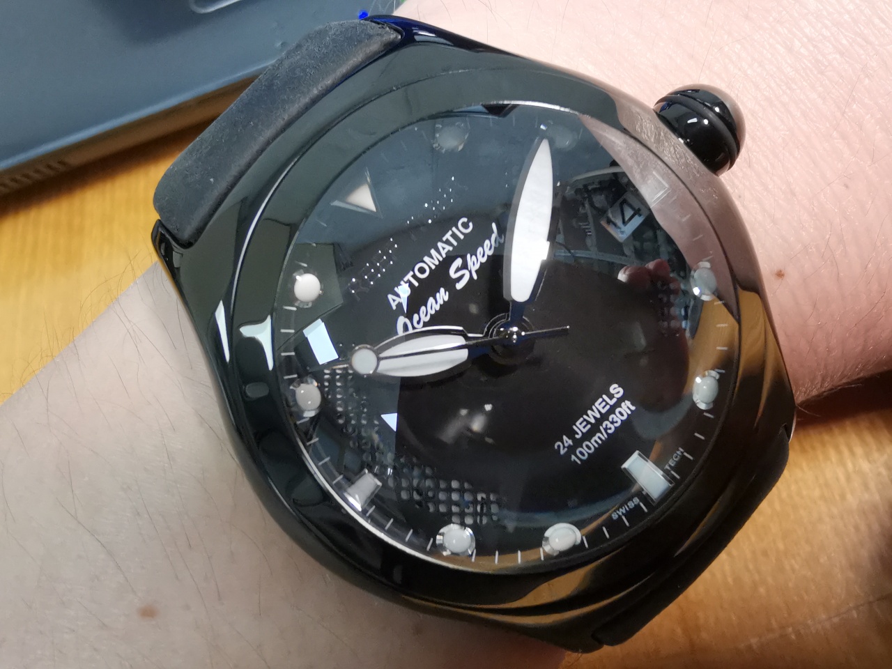 Корпус часов 43мм в диаметре,48мм с головкой, и 55мм от ушка до ушка, - изготовлен из нержавеющей стали с черным покрытием. Крпус сильно полирован со всех сторон, даже между ушками. Чёрное покрытие напоминает лаковую японскую шкатулку, нанесено равномерно по всем частям корпуса часов. Острых углов у этих часов нет, даже ушки настолько зализаны, что на руке не возникает препятствий при свободном вращении запястья. Безель классический, полированный, слегка выступает над корпусом часов. Стекло над циферблатом сапфировое, чему я очень удивился(но, прибор показывает именно так), учитывая цену часов, и предполагаемую сложность изготовления стекла. Циферблат простой,черный, матовый, перфорированный, - через отверстия можно разглядеть шкалу дат. Отметки часов накладные в форме "жемчужин", имеют люм, по силе свечения сравнимый с Ориентами. На циферблате присутствуют надписи Reef Tiger, automatic, Ocean Speed, 24 jewels, 100m/330ft, сделанные белой краской. Надпись бренда блестит хромом. Стрелки необычные, слегка раздутые, и лично мне напоминают заячьи уши. Секундная стрелка классическая. Стрелки имеют хромированную окантовку, и заполнены люминофором, светятся примерно так же как и часовые метки, но площадь свечения больше. Заводная головка шарообразная, полированная, имеет продольную канавку, в которой установлено резиновое кольцо, для удобства ухвата пальцами. Головка достаточно удобная, часы заводятся легко, без усилий. В часах установлен механизм NH35a, который за две недели беспрерывной работы ни имел ни одного нарекания. Запас хода около двух суток.