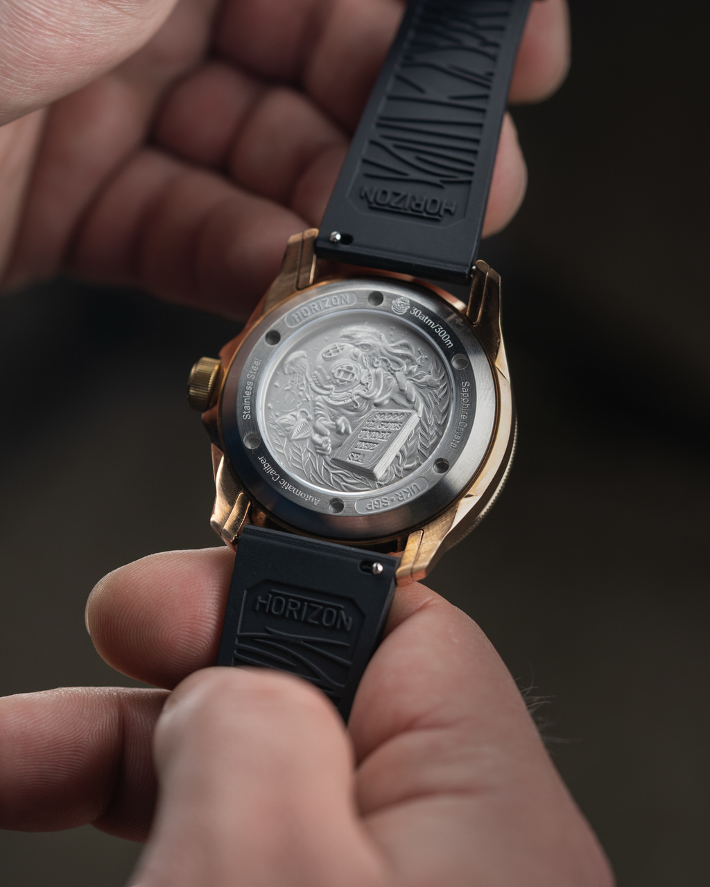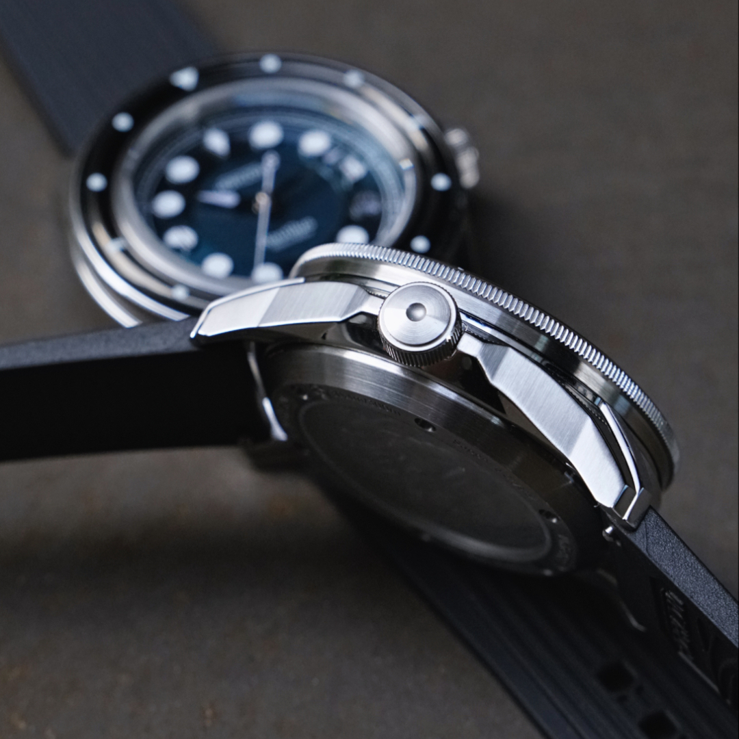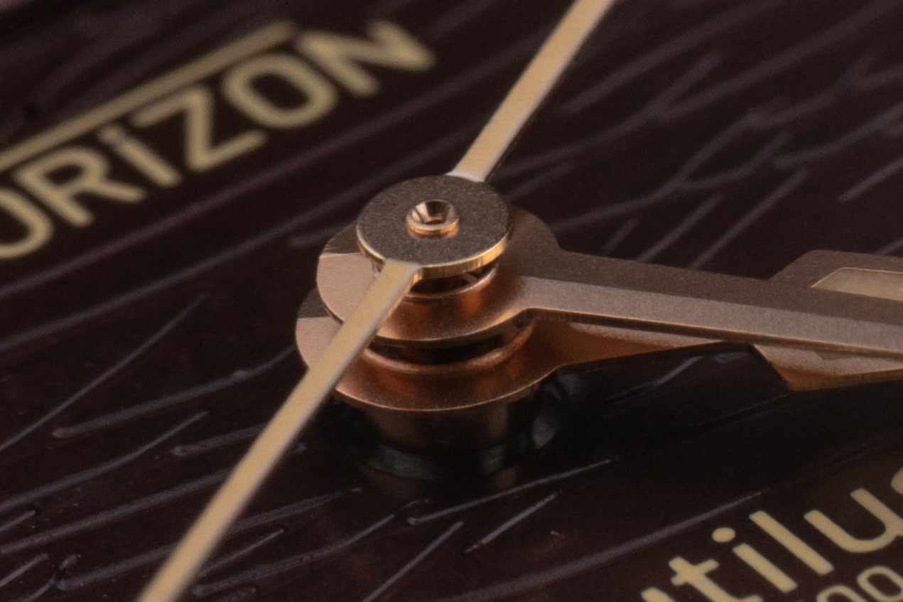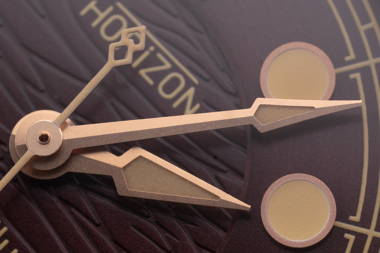 Концепция часов продумана до мелочей. Даже профиль бакли - чётко по размеру ремня. Ремень мне показался тонковатым. Пересадил на Ди-Модел Торнадо. Ширина между ушками - почти 23 мм. При желании можно втиснуть и "тяжёлую артиллерию" на 24 мм, но для моего запястья в 16 см это перебор. А вот гравировка порядкового номера и координат - очень мелкая. Полировка торцов строго противопоказана. Как бы патинирование эти надписи не съело