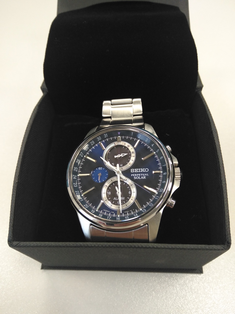 Сапфир, корпус и браслет из нержавеющей стали, браслет - литой, японская сборка, водонепроницаемость 100М, вечный календарь, секундомер, будильник, калибр V198, солнечная батарея.