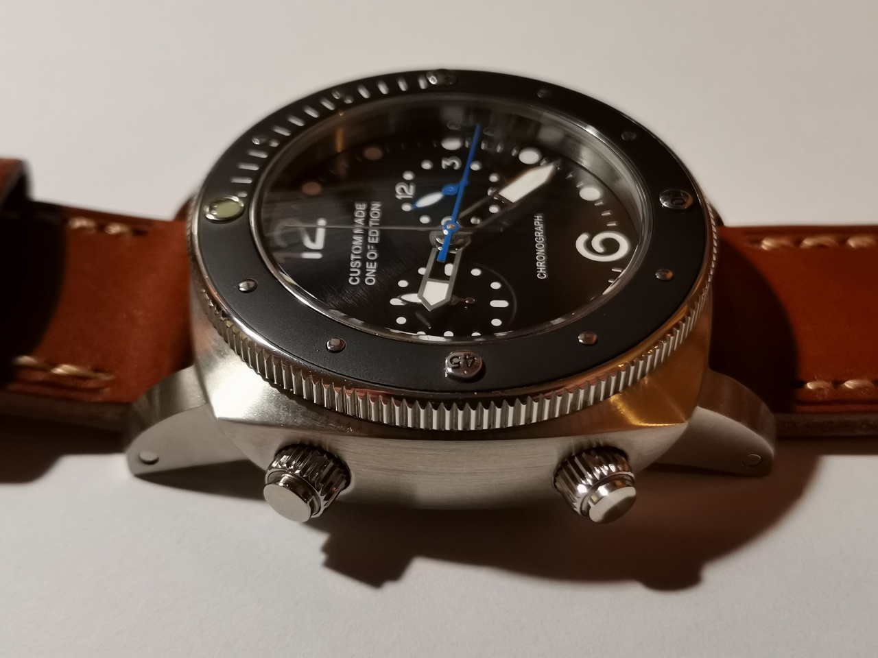 Теперь общие впечатления о часах. Корпус часов из нержавеющей стали с диаметром 47 мм, довольно крупный и толстый, из за высокого безеля и не тоненького корпуса. При осмотре критических замечаний по отделке корпуса замечено не было, даже внутренняя часть ушек обработана пусть и не идеально, но приемлемо. Корпус имеет крупное сатинирование, на фоне которого полированный безель смотрится довольно интересно. Безель имеет матовую темно серую керамическую вставку, слегка выступающую над краем безеля. Безель вращается против часовой стрелки на 60 щелчков, довольно плавно, но имеет заметный но небольшой люфт. При взгляде сбоку, если нажать на один край безеля, то на противоположном появляется небольшая щель. Фиксатор заводной головки выполнен достаточно аккуратно, работает без усилий и мягко закрывается. Заводная головка легко выдвигается для перевода стрелок. и так же легко двигает стрелки, без усилий. При этом двигаются только часова, минутная, стрелки, и стрелка малого циферблата с 12 делениями, но при обороте больших стрелок на один час, стрелка малого циферблата проходит только полчаса. Часы позиционируются как хронограф, поэтому левый циферблат видимо считает минуты. Зачем-то сделали две секундных стрелки, которые двигаются синхронно в режиме хронографа, и одна от другой закреплена намертво на расстоянии 17 секунд. Кстати при установке механизма производитель не озаботился 100% функционированием хронографа, и штырьки утопленных(скрытых) кнопок никак не дотягиваются до соответствующих мест на механизме. Поэтому, к сожалению, даже как хронограф часы не работают. На корпусе имеются две симпатичные и совершенно не функциональные кнопки на левой стороне часов. Видимо производитель предполагал устанавливать в эти же корпуса и другие механизмы, но ввиду спроса продает часы и в таком "урезанном" варианте. Сразу мне вспомнились мои советские магнитофоны , у некоторых часть кнопок была предназначена для полной комплектации, но продавали и усеченные варианты.
