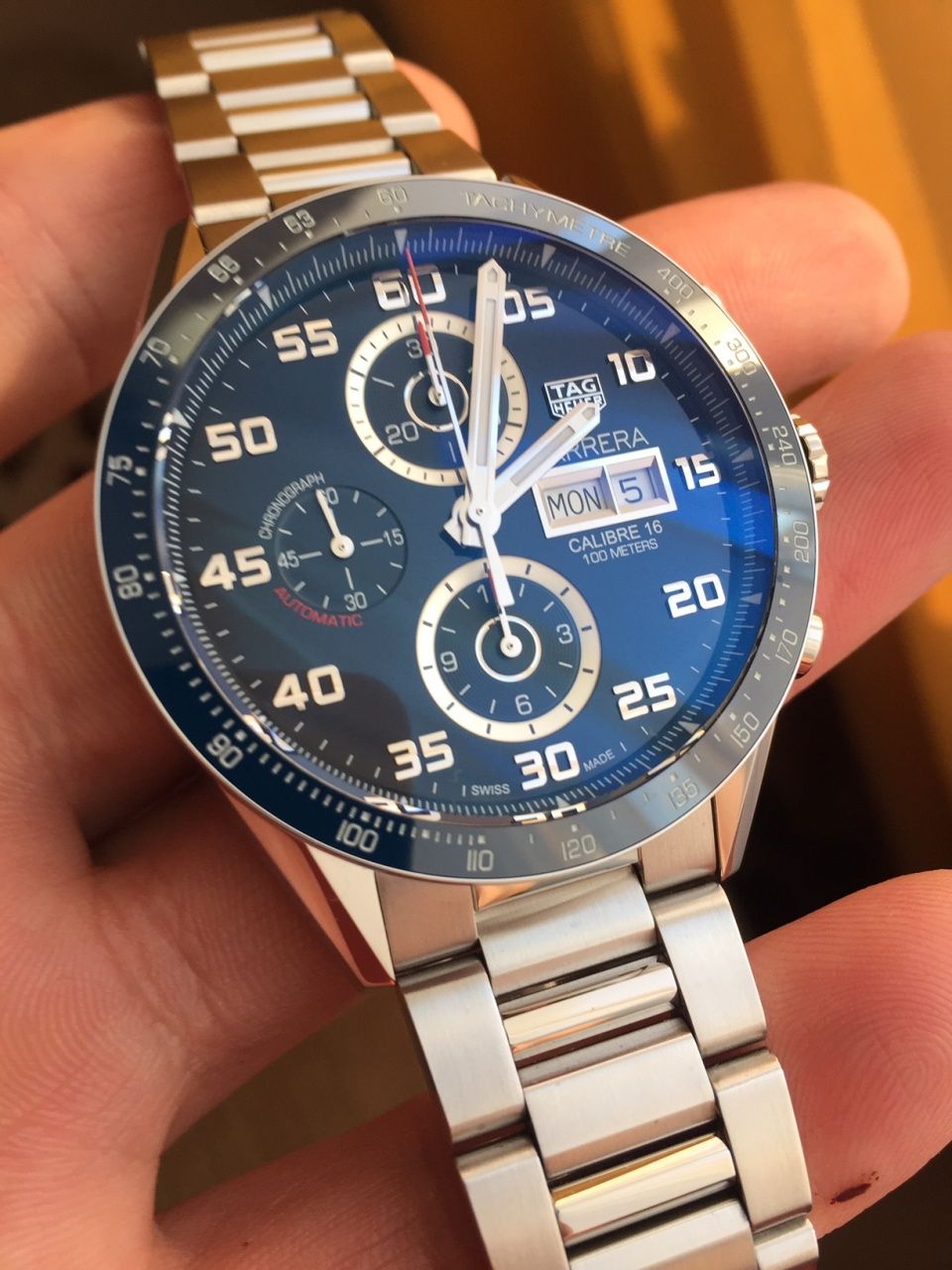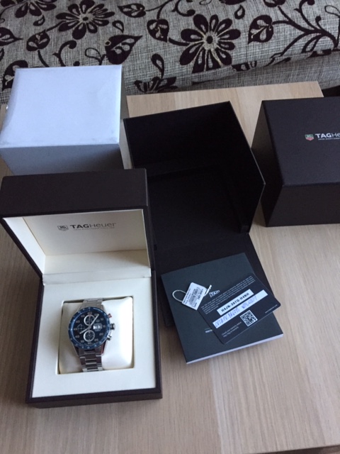 Красивый и очень практичный механический хронограф от Tag Heuer и их культовой линейки CARRERA. Диаметр 43 мм. Синий фейс и синий керамический безель. Смотрятся СУПЕР!!! А в солнечную погоду просто ОГОНЬ!!! Идеальное состояние. Не вскрывались .Не полировались . Одевались несколько раз - так называемую " паутинку" на полированных частях не вооруженным глазом не рассмотреть. Полный комплект. Год покупки 11.06. 2019. Стоимость новых 285 000₽. Часы из личной коллекции поэтому торг минимальный.