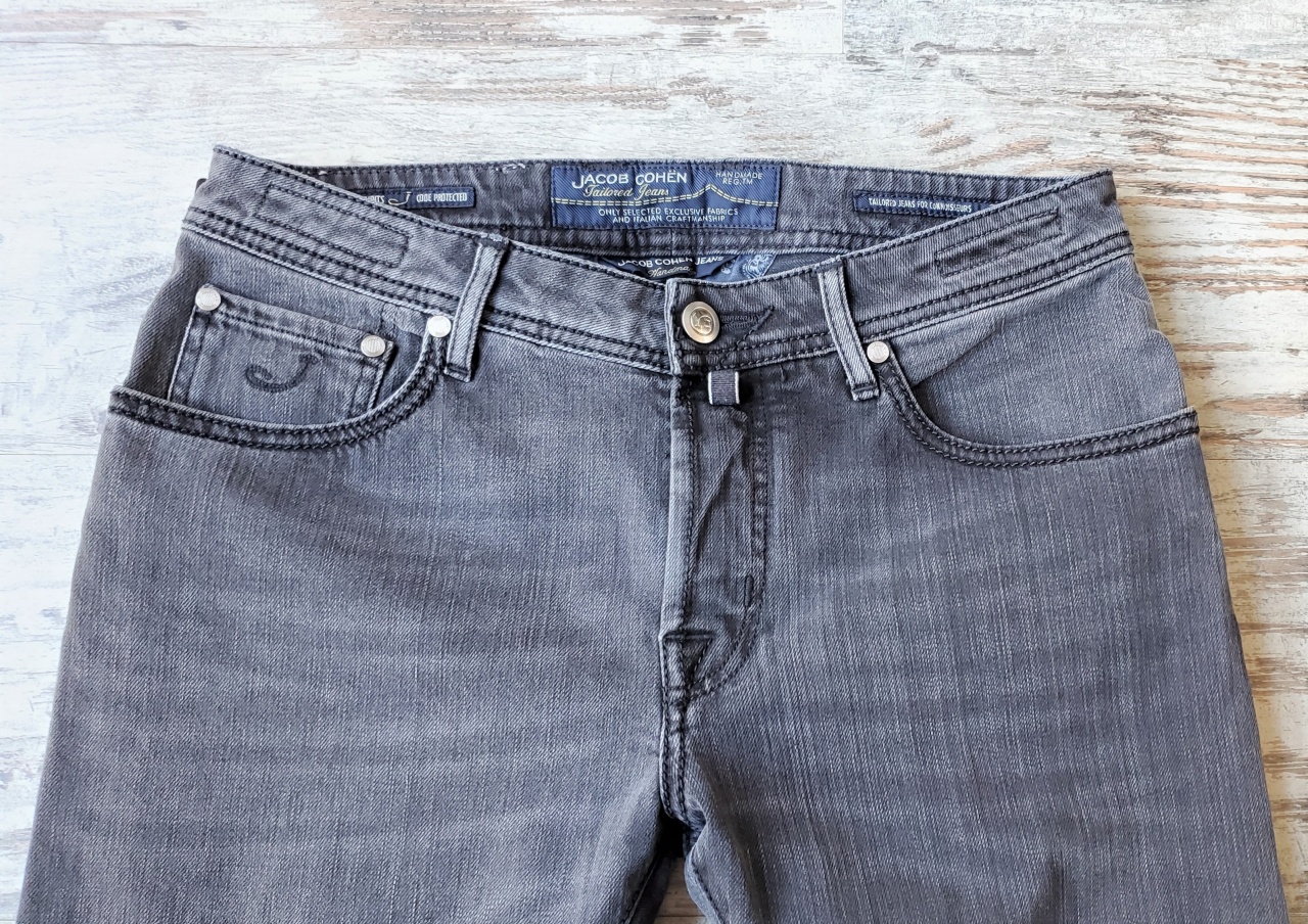 Сзади на правом бедре джинсы имеют фирменный ярлык с логотипом марки Jасоb Соhеn, выполненный из металла, что указывает на принадлежность к "лимитированной" линейке марки и порядковый номер - 001