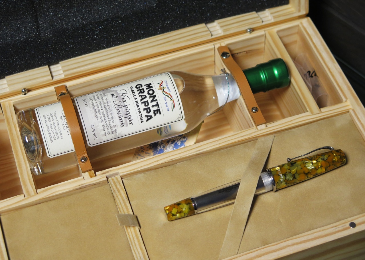 Ручка идет в комплекте с оригинальной винтажной шкатулкой из дерева, бутылкой местного крепкого напитка граппы и флаконом чернил (для перьевых моделей).