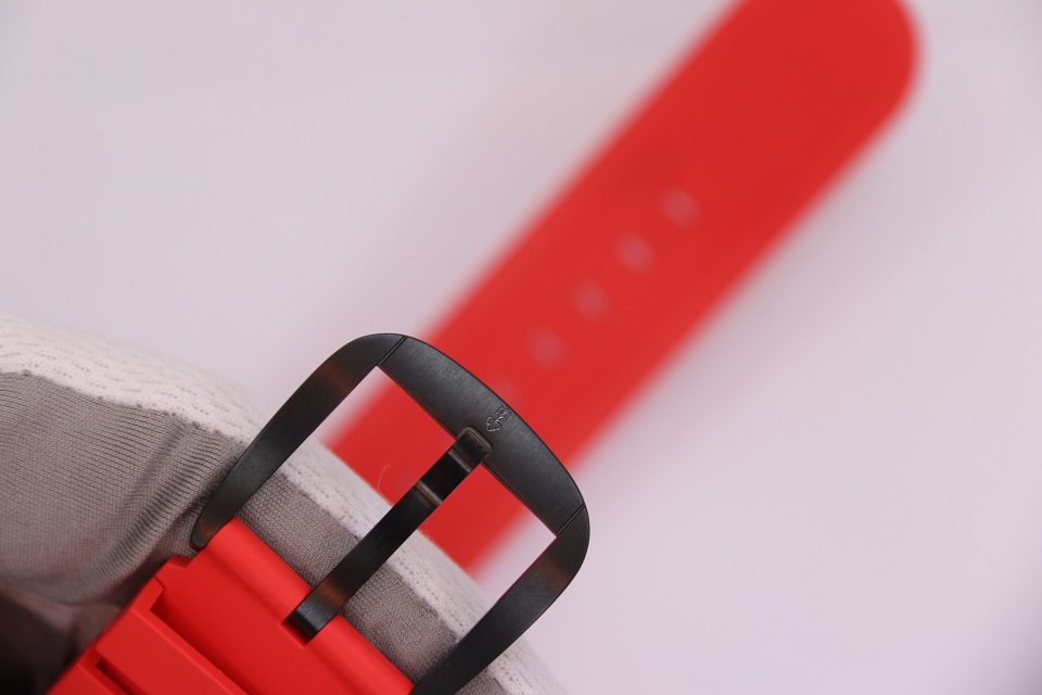Ремень: красный вулканизированный каучук, застежка шипом / нержавеющая сталь с черным PVD покрытием.