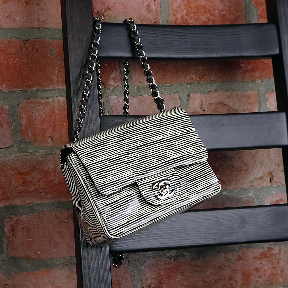 Круизная коллекция, в которой была представлена эта модель, посвящена тропикам. Отсюда и особенность этой модели - уникальный окрас и рисунок в виде чередующихся штрихов. По замыслу Карла Лагерфельда, этот узор на сумке символизирует лучи солнца, пробивающиеся сквозь горизонтальные плетеные жалюзи на окнах традиционных тропических домов и бунгало. Уникально и необычно. Сразу видно лимитку Шанель.