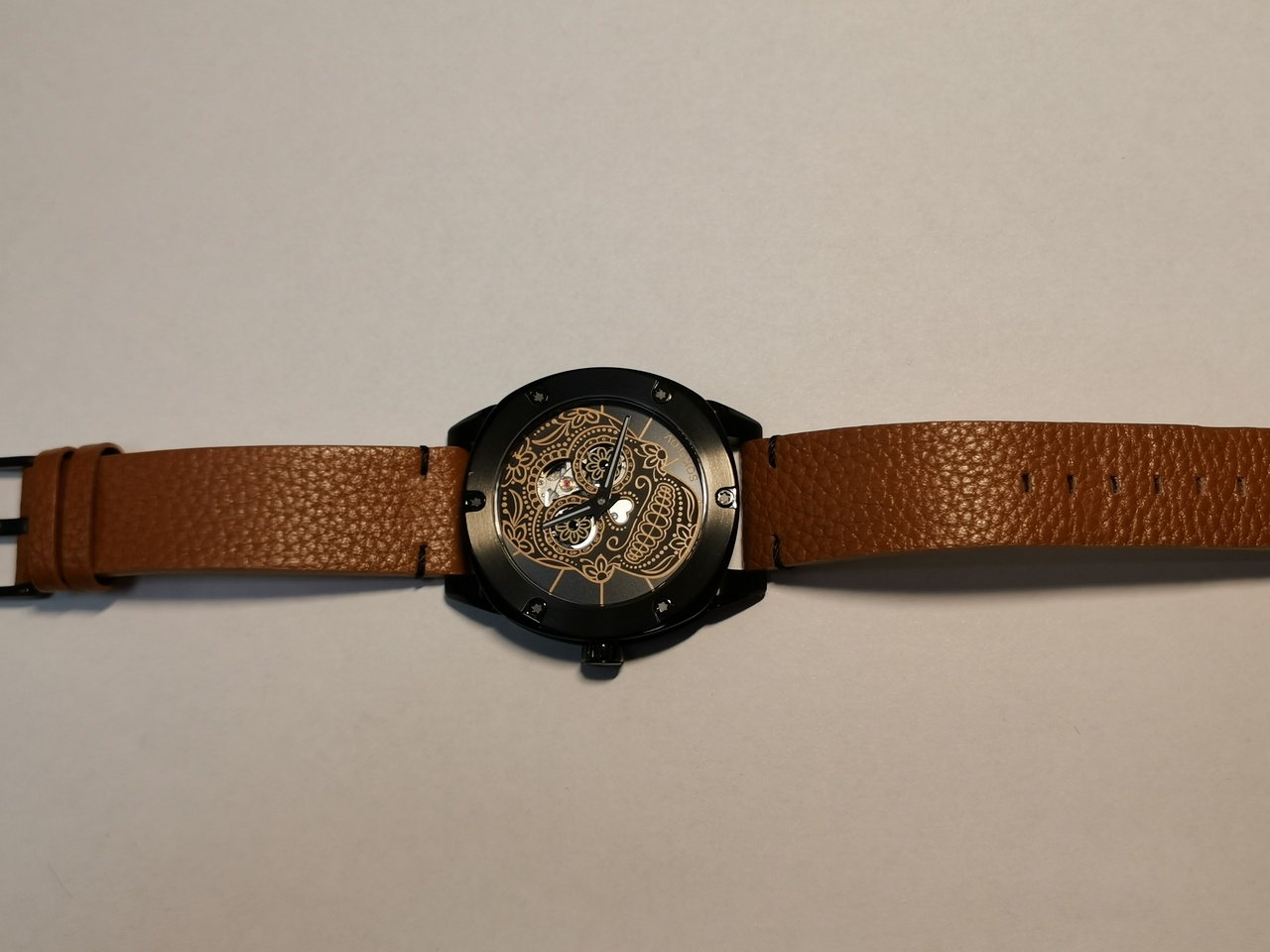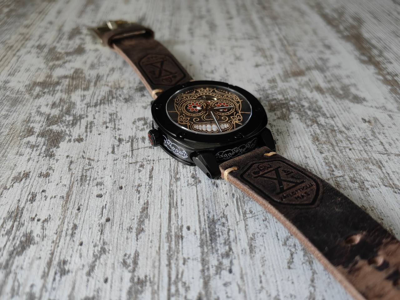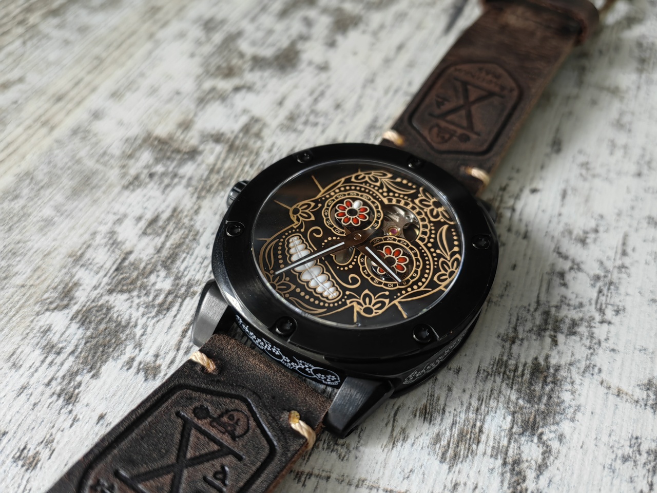 Но, самым лучшим дизайнерским решением, я считаю - применение в данной модели механизма Miyota 82s7. Это механизм с открытым балансом, имеющий две малых стрелки, одна из которых секундная, другая показывает время в 24х часовом формате. У многих производителей часов (Bulova, Armani, Lobinni, Reef Tiger и прочие) использовавших этот механизм, в итоге получался плохо читаемый циферблат. Не исключение и эти часы,- вряд ли на малых циферблатах удастся с уверенностью зафиксировать определенные отрезки времени. Однако, дизайнерское решение о переносе заводной головки на левую сторону корпуса, позволило использовать малые циферблаты в качестве глаз доминирующего изображения. (таким образом можно изготовить серию серию моделей с разными изображениями) Вместо стрелок на малых циферблатах установлены миниатюрные "цветочки", которые двигаются согласно скорости механизма. Особенно оживляет изображение на циферблате левый глаз, цветочек в котором находится в постоянном движении. Открытый баланс прямо на "лбу" черепа, если не украшает, то по крайней мере добавляет немного стимпанка в общую картину. В целом облик часов говорит о том, что они наиболее уместно будут смотреться на тематических вечеринках, походах в кафе и детских праздниках, то есть для не очень серьёзных, "атмосферных" выходах в свет.