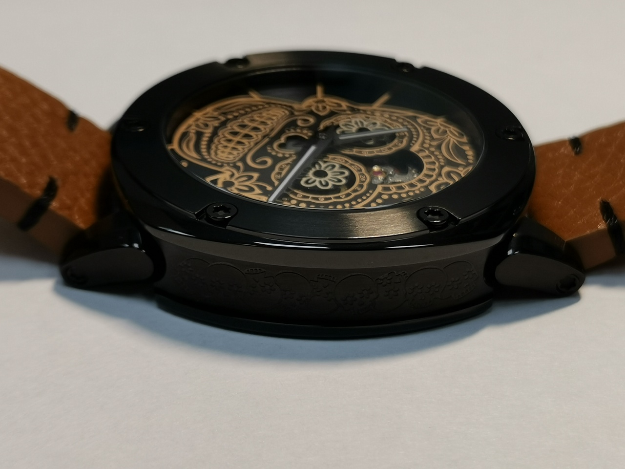 Самыми явными привлекательными качествами этих часов являются дизайнерские решения по оформлению внешнего вида модели. Мне понравилась брутальная форма корпуса отдаленно напоминающая Памы. Чёрный цвет усиливает это впечатление. Интересным решением было сделать "ушки" подвижными, так действительно удобнее.(Подобное решение было у одной из ретро моделей Fossil) Сочетание полированных и сатинированных поверхностей делает часы привлекательнее. Размещенный на циферблате рисунок виде стилизованного под латиноамериканские народные мотивы череп выполненный светло-охристой краской, является центральным доминирующим элементом. Интересно, что дизайнеры приняли решение сделать внешний контур изображения и некоторые детали светящимися в темноте, добавив в краску люминофора. Эффект действительно впечатляющий.