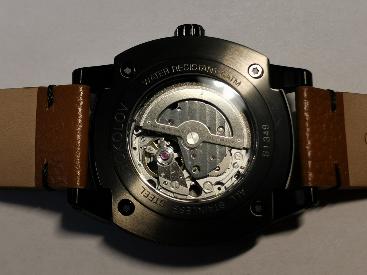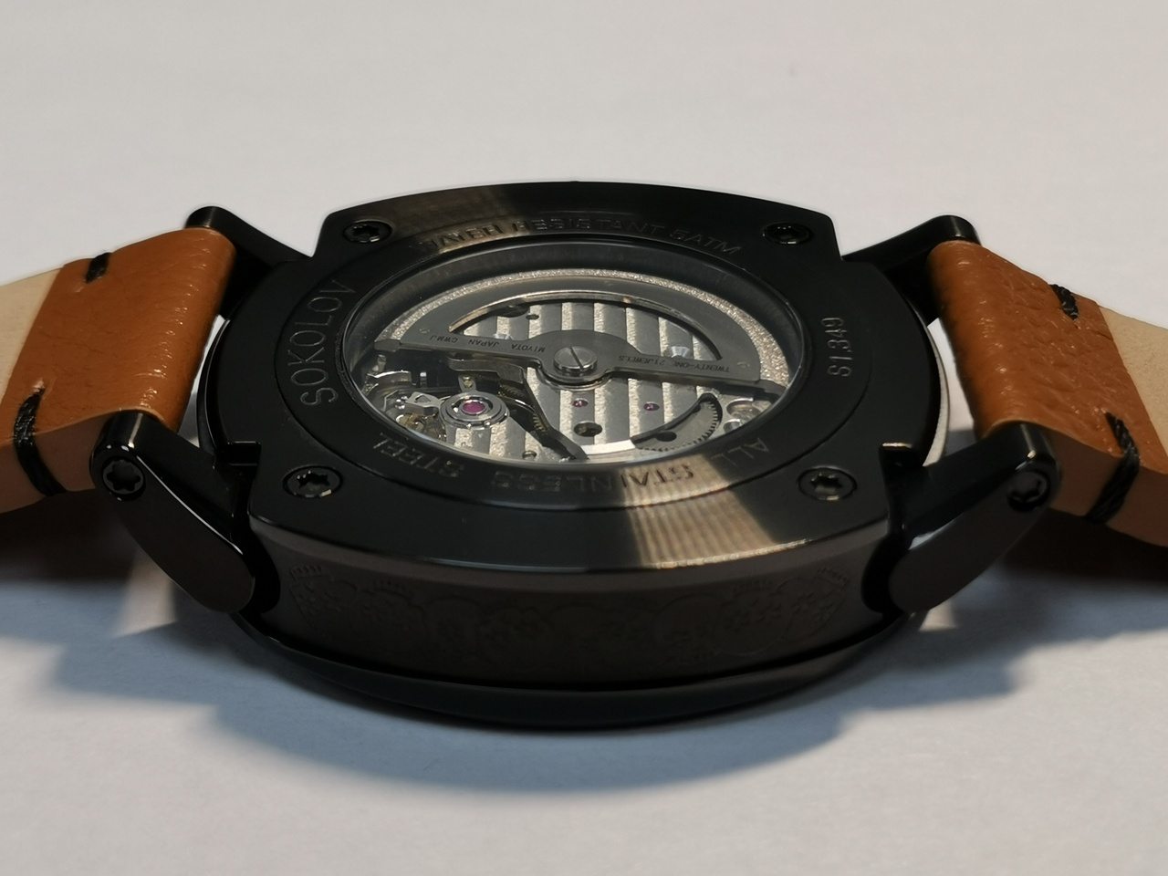 Задняя крышка плоская в целом подушковидной формы с фрезерованными углами, предназначенными для свободного движения в обозначенных рамках ушек. Крышка крепится к центральной части корпуса четырьмя винтами, визуально схожими с теми, что установлены на безеле. В центральной части крышки имеется круглое окно, через которое полностью виден механизм часов. По периметру окошка задней крышки нанесены надписи: Sokolov, water resistant 5 atm, all stainless steel, s1.349.
