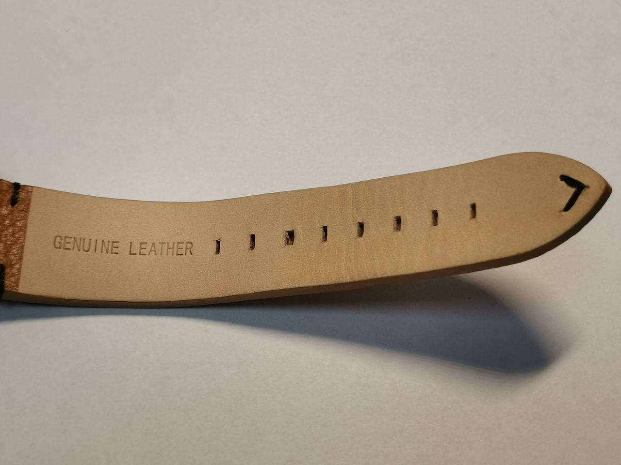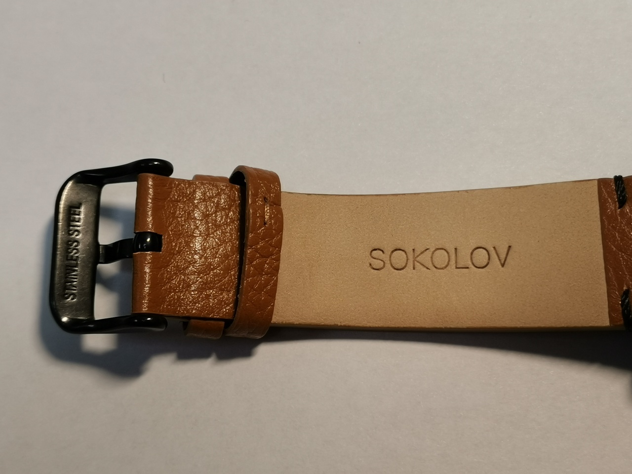 Между ушками на шпильках установлен толстенький ремешок, вероятно кожаный. На ремешке есть оттиснутые надписи: SOKOLOV, Genuine Leather. Ремешок вероятно двухслойный, верхний слой имеет текстуру кожи, возможно имитированную. Нижний слой плотный, замшеподобный. При намокании не увеличивается в объёме и своих характеристик не меняет, появляется слабый запах кожесодержащих изделий(типа кошелька). Декоративная прострочка скупо присутствует в районе ушек по обеим сторонам ремешка и на самом его кончике. Край ремешка обработан гибкой краской в цвет ремешка. Бакля штампованная из стали толщиной 2мм, черного цвета с гравированной надписью на сатинированной поверхности - Sokolov.