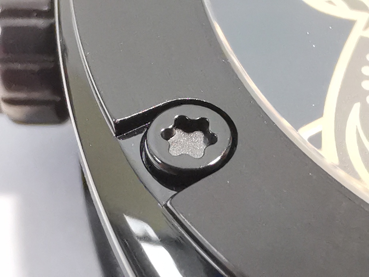 Декоративный безель плоский, накладной. Внешняя геометрия безеля близка к подушковидной. Верхняя декоративная площадка безеля плоская, круглая с шестью равноудаленными фрезерованными U-образными местами посадки для винтов. Соответственно шесть винтов, шляпки которых имеют шлиц в виде звездочки, там же и установлены, возможно с целью крепежа безеля к центральной части корпуса.