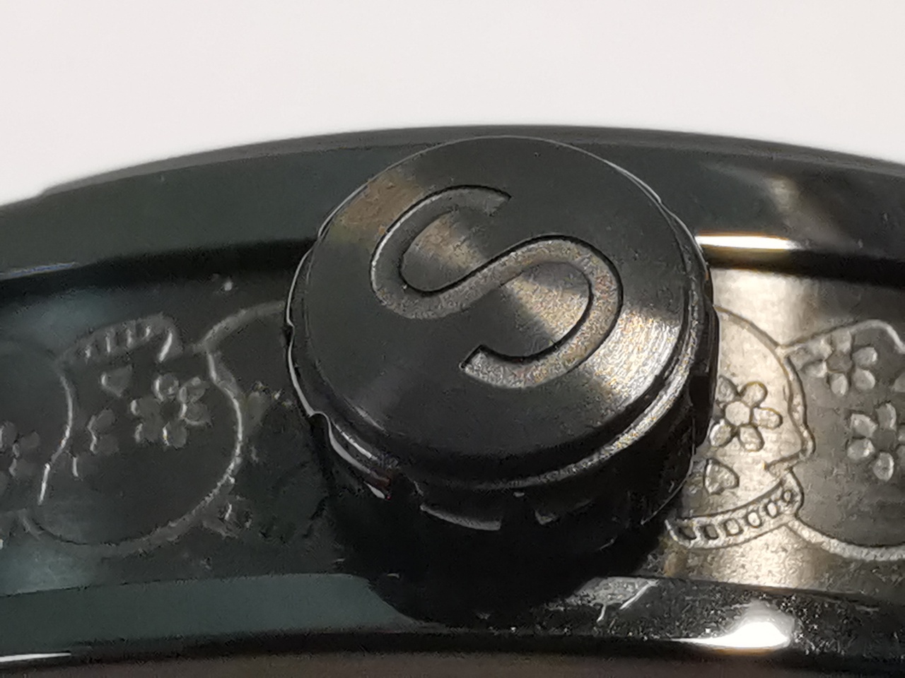 Заводная головка приплюснутой таблетковидной формы, "гурту" имеет редкие вертикальные насечки. Верхушка головки на ступеньку приподнятая, слегка выпуклая. На сатинированном поле верхушки глубоко выгравирована рубленым шрифтом крупная латинская буква S.
