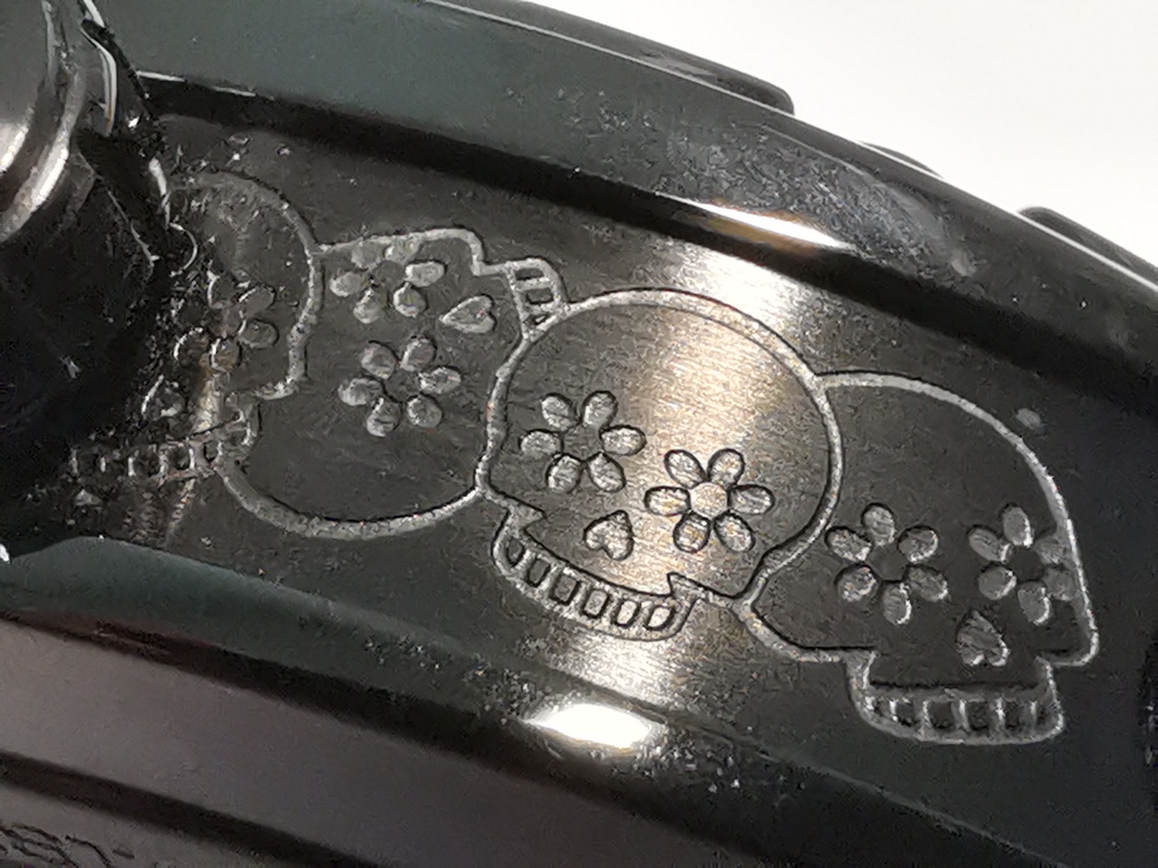 Корпус из нержавеющей стали имеет полное PVD покрытие черным цветом. Центральная часть корпуса подушковидной формы, имеет фрезерованные "ниши" для ушек, поверхность её сатинирована. По всем открытым участкам размещены гравированные изображения цепочки черепов в несколько утрированном стиле.