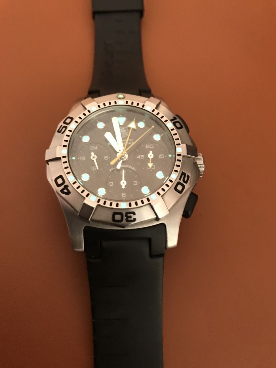 Часики очень редкие - идеальный дайвер. Tag Heuer Aquagraph где каждая деталь проработана с особой точностью. Даже Поворот безеля осуществляется нажимом А не как в дешевых (акварейсерах) обычным вращением Это действительно дайверы а не имитация под дайверы ) эти Часы Украсят любую коллекцию Выпущено 1000 шт. В таком идеальном состоянии найти их очень трудно Я единственный хозяин часов -покупал в Германии у оф представителя. Все работает исправно стрелки встают в ноль. Ход точный, недавно делал проверку на саввинской набережной 19. Хрон имеет очень много полезных функций , показывает Разные отрезки времени , показывает время суток - день или ночь. В комплекте имеется родной стальной браслет, оригинальный новый каучуковый и новый ремень нато.